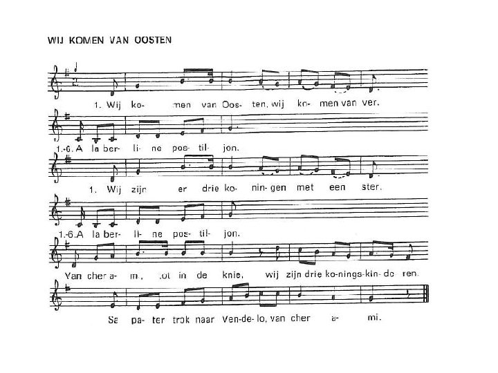 Wij hebben gezongen al voor dit huis, à la berline postiljon, geef ons een penning dan gaan we weer naar huis, À la berline postiljon. Van cher ami tot in de knie, wij zijn drie koningskinderen, sa pater trok naar Vendelo van cher ami,