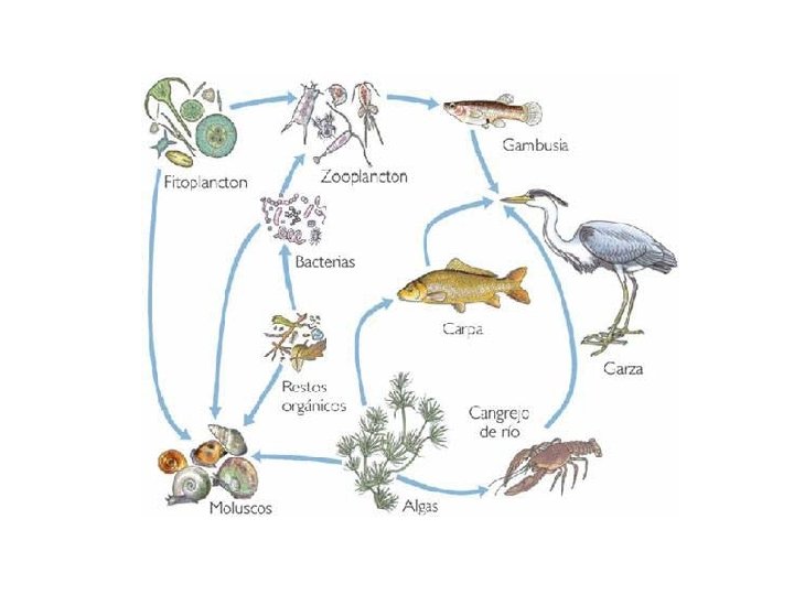 • En las cadenas tróficas marinas u oceánicas existen: – Productores: el fitoplancton y las algas microscópicas – Consumidores primarios: el zooplancton o plancton animal – Consumidores secundarios: Los peces de pequeño tamaño, crustáceos, moluscos, etc. – Consumidores terciarios: peces de mayor tamaño – Descomponedores: bacterias que descomponen los restos de seres vivos.