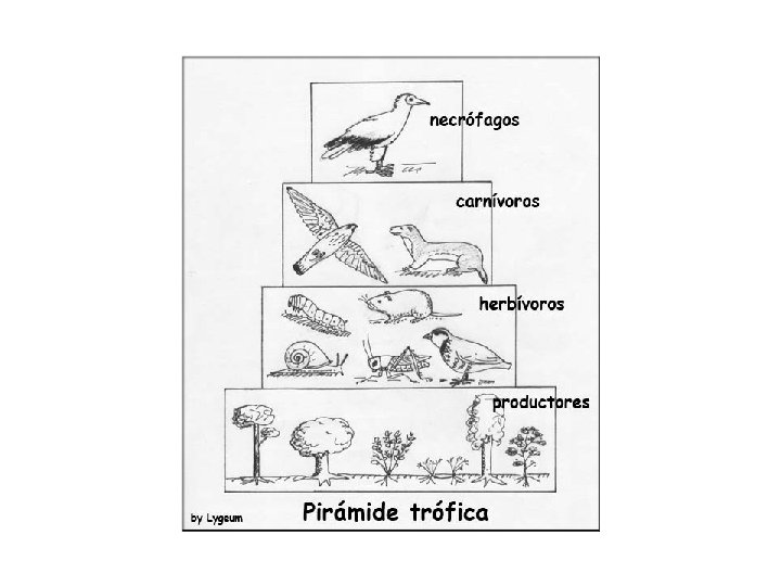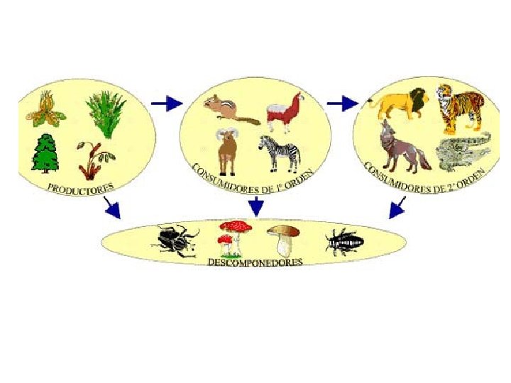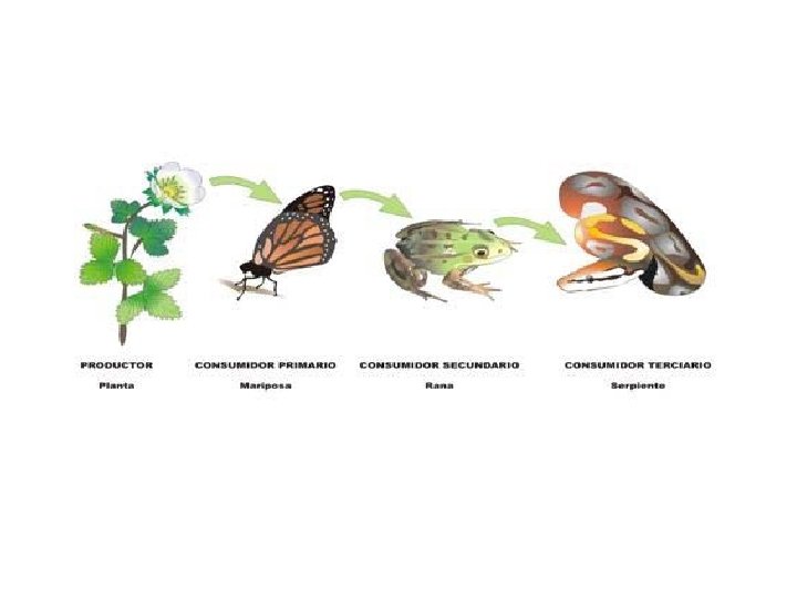 Niveles tróficos • El primer nivel es el productor, los seres fotosintéticos. • El segundo nivel son los consumidores primarios, los herbívoros. • El tercer nivel son los consumidores secundarios, los carnívoros. Y éstos a su vez podrían ser consumidos por un nivel cuaternario, los consumidores terciarios. • Existe otro nivel, el de los descomponedores, que se encargan de devolver al suelo la materia que fue adquirida por los vegetales para la fotosíntesis.
