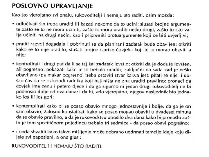 MANAGEMENT I MANAGERI ZA KONKURENTNOST PODUZEĆA Management danas definiramo na više načina. To je: - Optimalna uporaba resursa za proizvodnju i usluge. - Rad delegiranjem zadaća, u kojima će se optimalno iskoristiti resursi. - Proces kojim grupa čelnih ljudi usmjeruje akcije ostalih prema zajedničkim ciljevima. - Uključivanje koordinacije ljudskih i materijalnih resursa prema objektivno utvrđenom ciljnom postignuću. - Koordinacija svih resursa putem planiranja, organizacije, rukovođenja i kontrole, i to prema dogovorenim ciljevima. - Uspostavljanje učinkovitosti „okoliša” za ljude koji rade u formalno ustrojenim grupama. - Obuhvaćanje djelatnosti što ih poduzima jedna, ili više osoba kako bi koordinirala rad grupe ljudi, koji pak pojedinačno ne bi mogli postići ciljeve poduzeća.