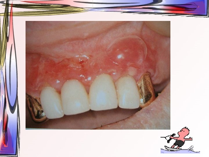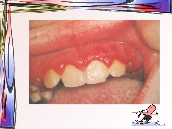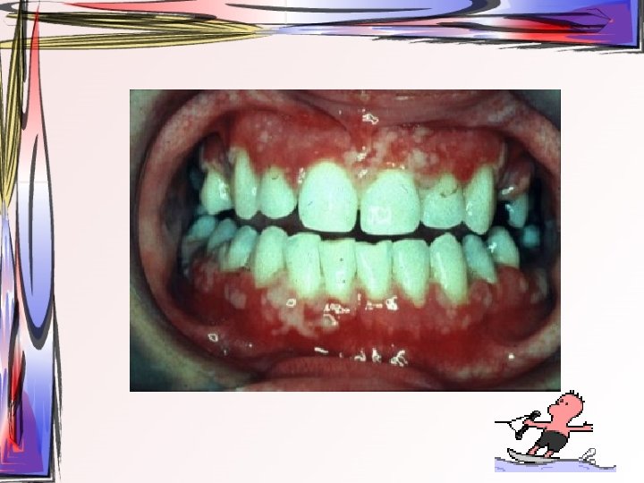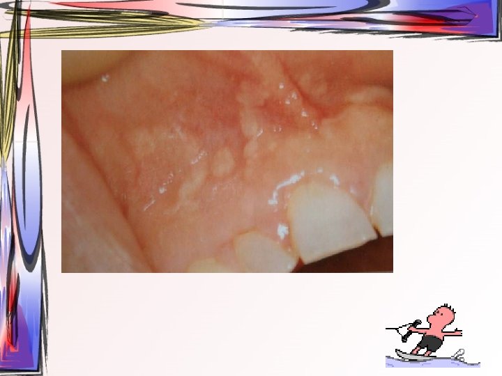 • Özellikle gingiva – Yama şeklinde eritematöz alanlar, özellikle yapışık dişetinde – Rutin oral hijyenin yapılmasına engel • Oral mukozada sadece gingivada erozyondan, damak, bukkal mukoza, dil ve ağız tabanını da içine alan geniş vezikülo-büllöz lezyonlara kadar değişen klinik tablo