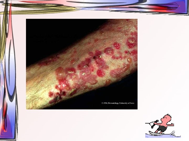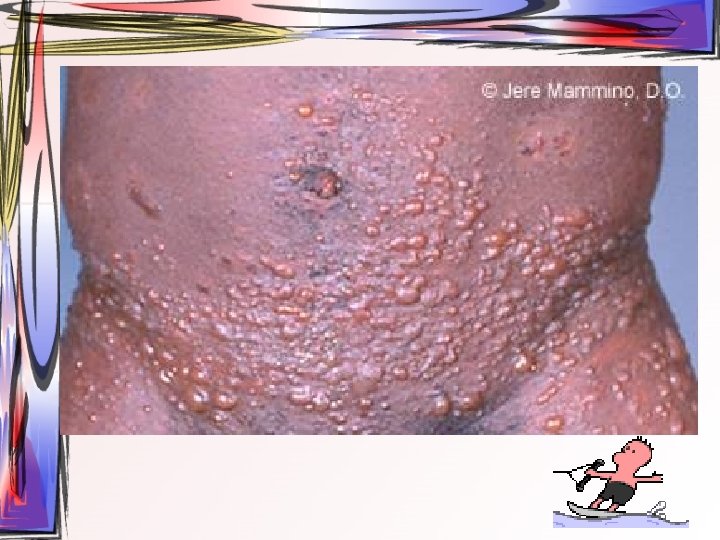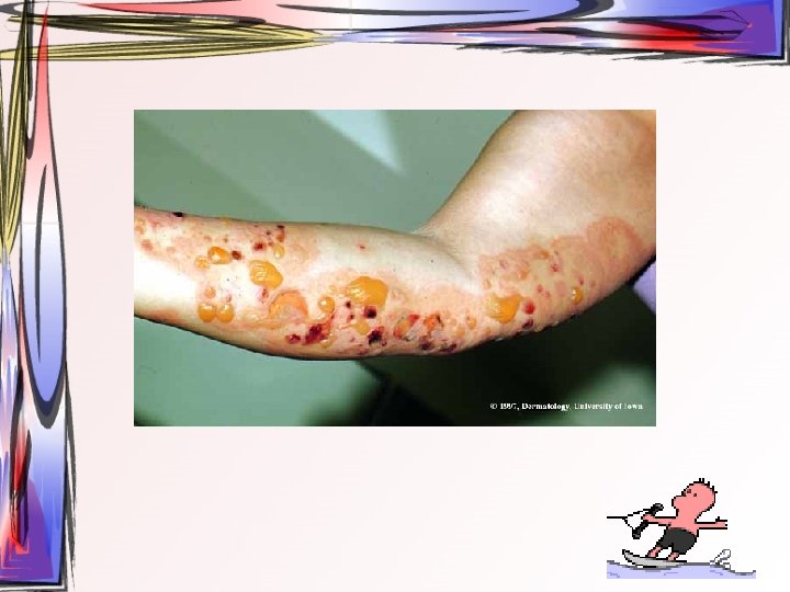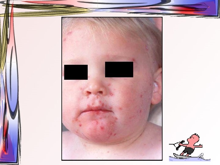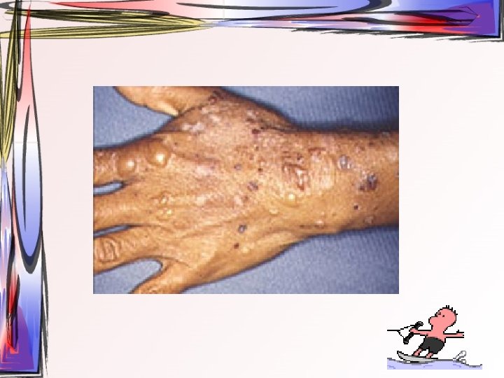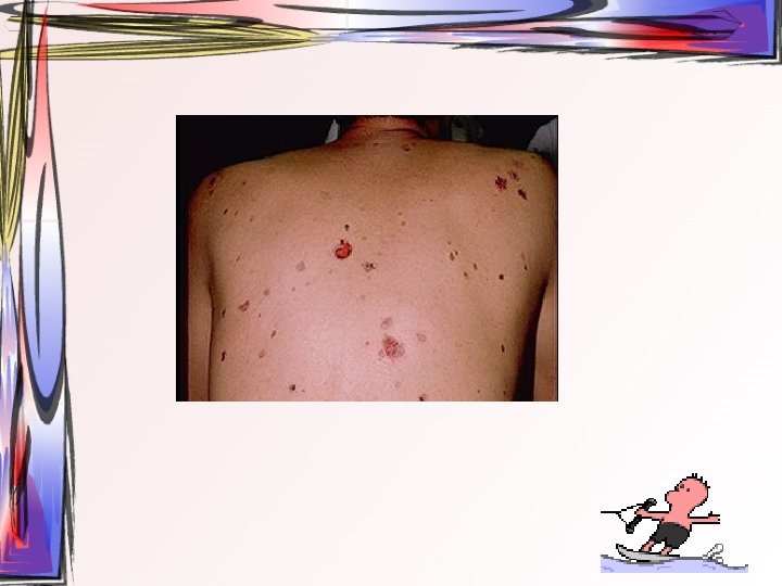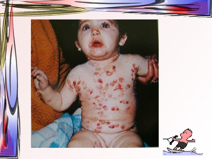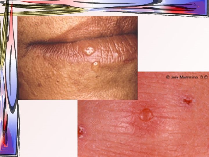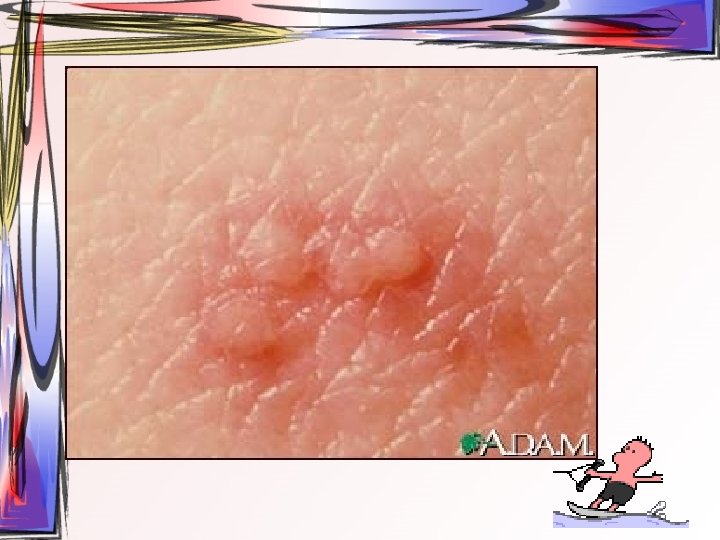 • Maküller, papüllere ve veziküllere dönüşürler. Ardından ülser halini alırlar. Hastada bütün tip döküntüler aynı zamanda bulunur. • Oral müköz membranlar ve saçlı deri de da tutulum gösterebilir. • 2 -3 hafta içerisinde iyileşir • Duyu sinirlerinin ganglionuna yerleşir ve latent olarak burada kalabilir.
