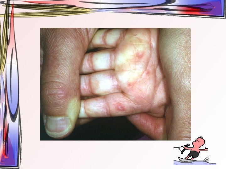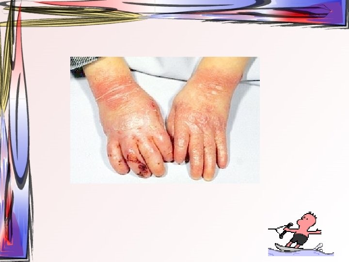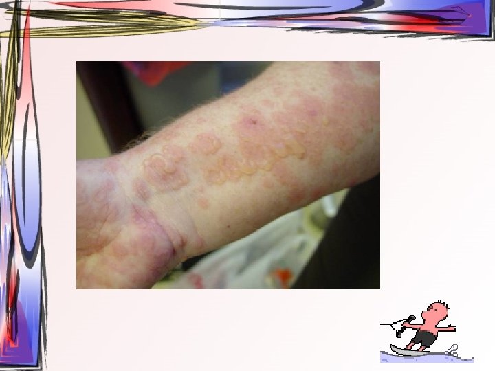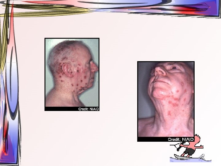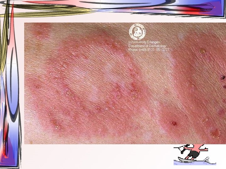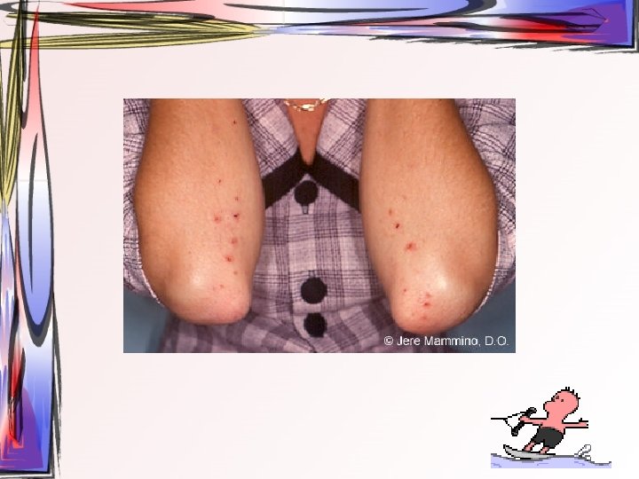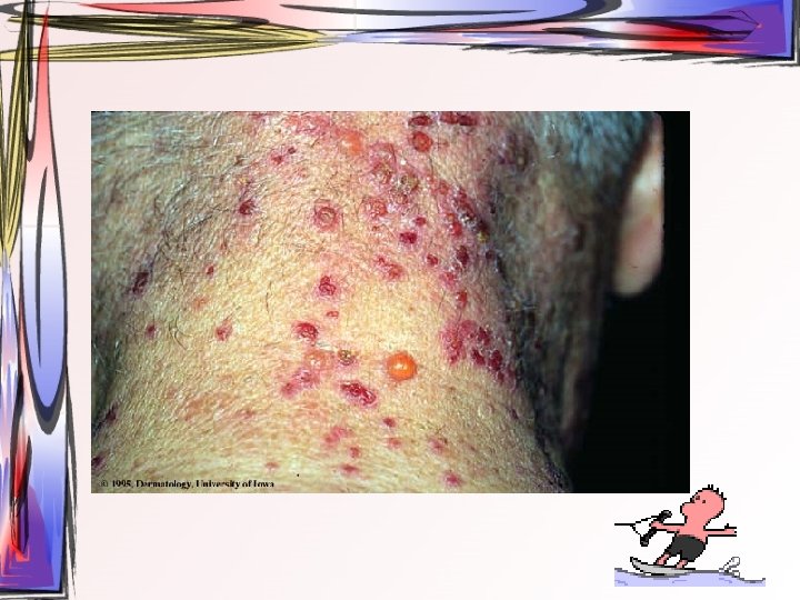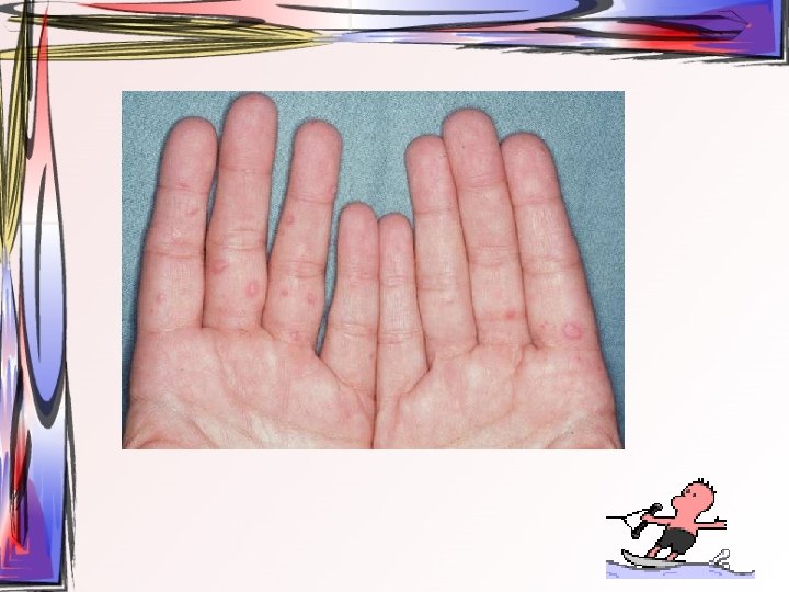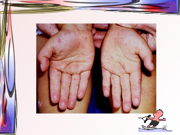 • Maküller, papüllere ve veziküllere dönüşürler. Ardından ülser halini alırlar. Hastada bütün tip döküntüler aynı zamanda bulunur. • Oral müköz membranlar ve saçlı deri de da tutulum gösterebilir. • 2 -3 hafta içerisinde iyileşir • Duyu sinirlerinin ganglionuna yerleşir ve latent olarak burada kalabilir.