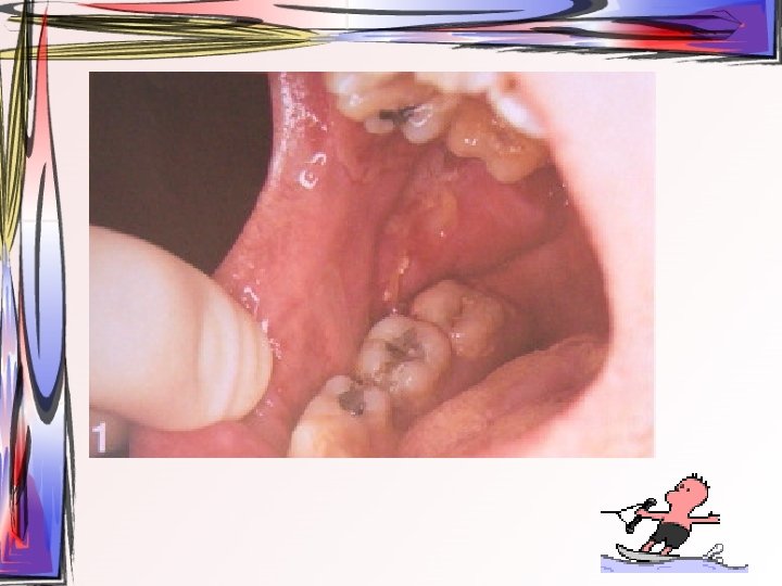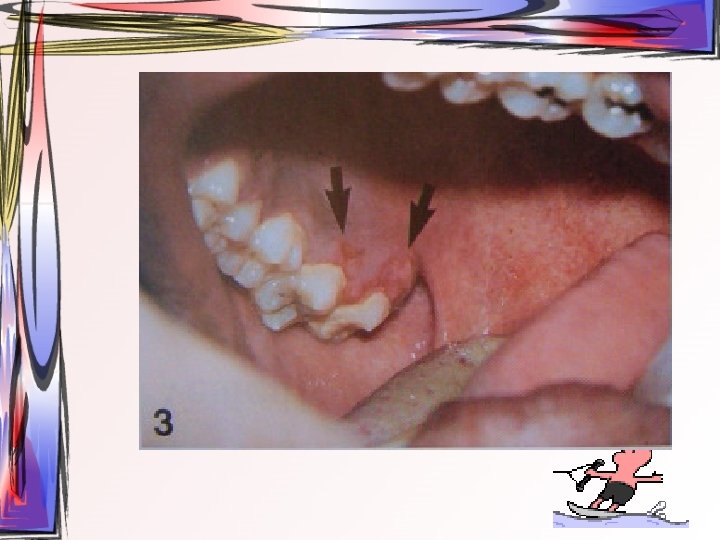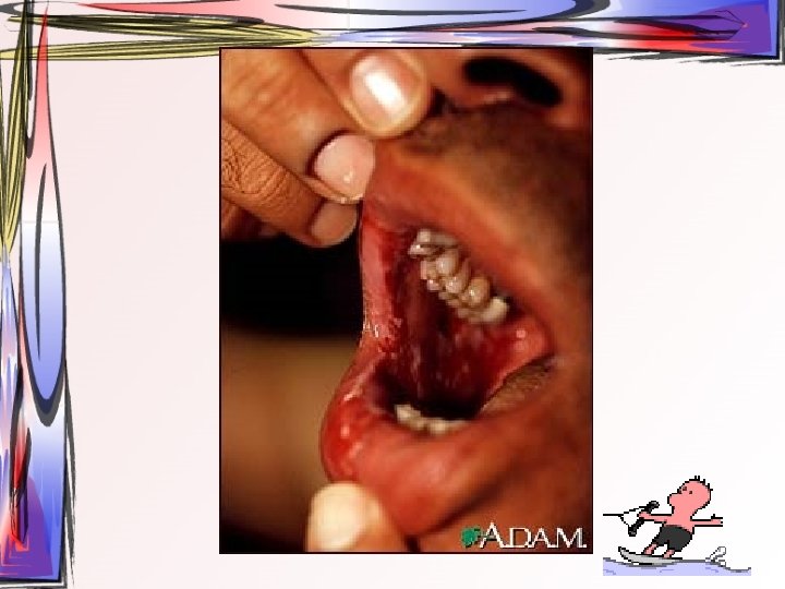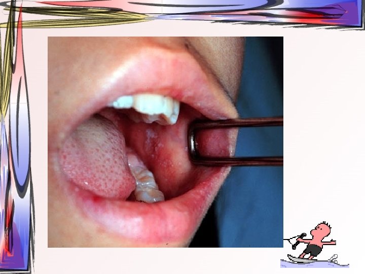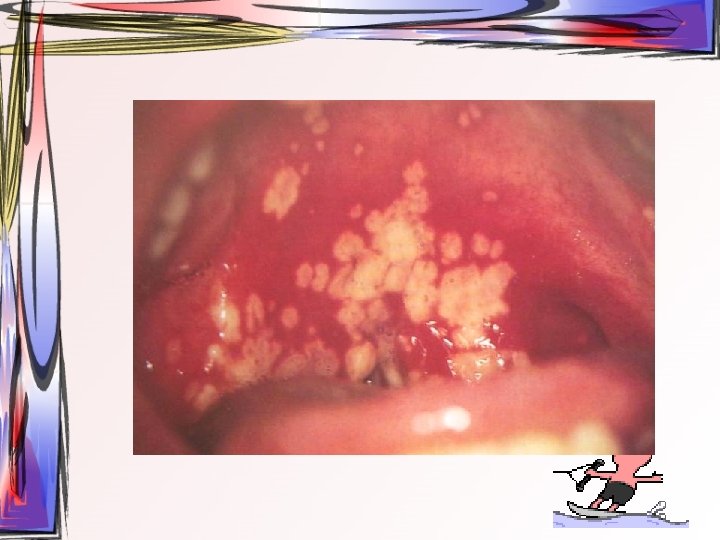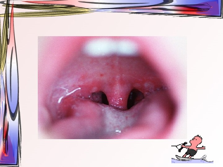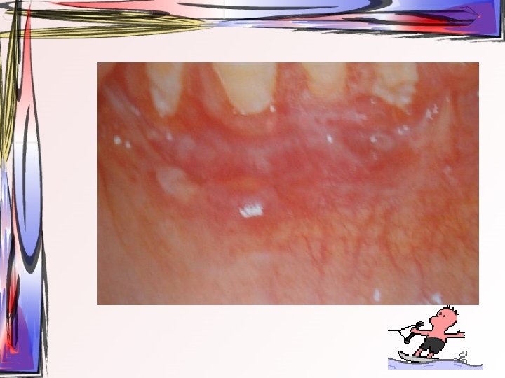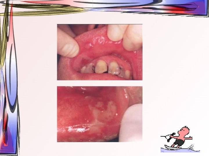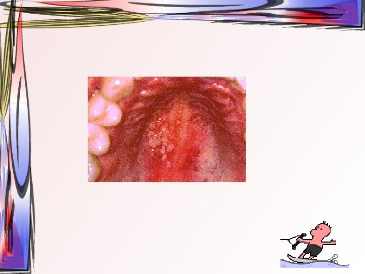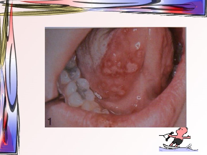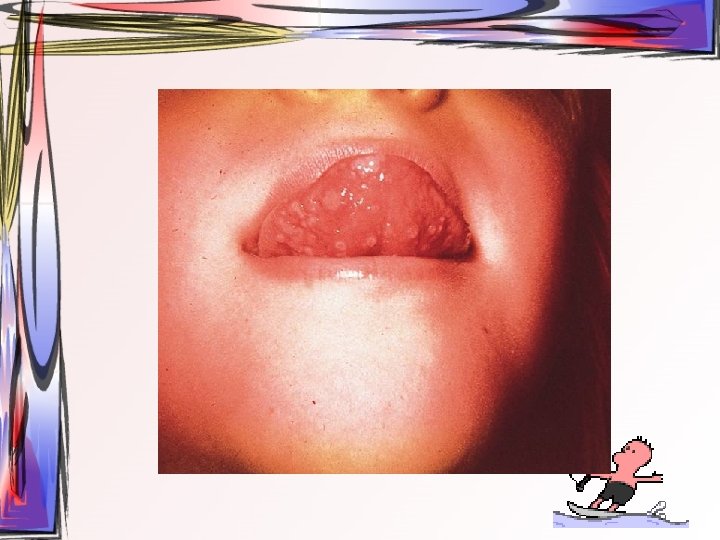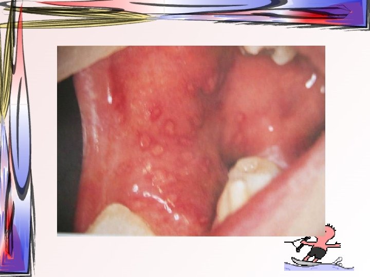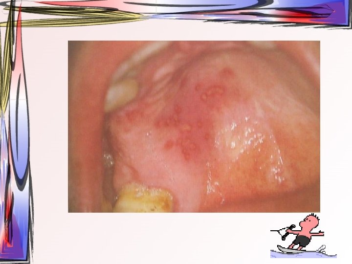 • lezyonlar oral bölgede her yerde görülebilir • hafif ateş, kırgınlık, lenfadenopati görülür • Oral kavitede mevcut ülseratif lezyonlardan kaynaklı ağrı asıl şikayet • Ayırıcı tanı – Primer herpetik gingivostomatit – Varisella zoster • tedavi semptomatiktir, • 1 -2 hafta içinde kendiliğinden iyileşir • Gargara