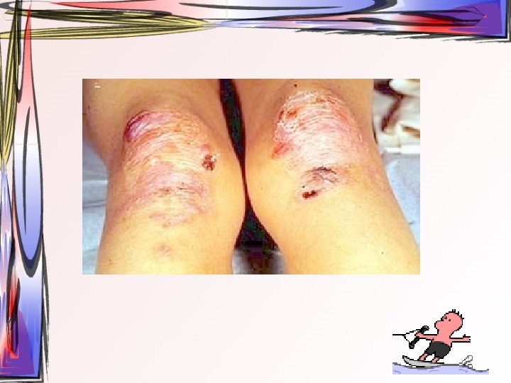 • Bülleri takiben ülser oluşur • % 60 ilk belirtiler oral bölgede (önce ağızda başlar, en son ağızda iyileşir) • Klinik olarak sağlıklı gözüken mukoza üzerine hafif bastırarak sürtme ile epitelde ayrılma ve bül oluşur (Nikolsky belirtisi) • Deri lezyonu