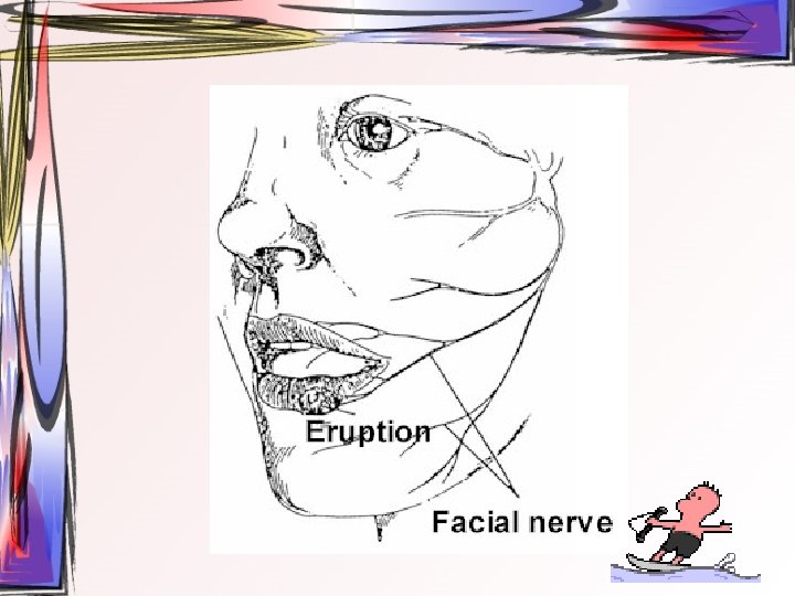 • Ağrı ve parestezi gibi prodromal semptomlar vardır. • Lezyon tek taraflı lokalizedir ve trigeminal sinirin bir veya birkaç dalını tutabilir • Prodromal semptomların görülmesinden sonra makülopapüler kızarıklık görülür ve bunu vezikül ve ülserasyon takip eder • Hastaların % 10’unda postherpetik nevralji gelişir. • Tekrarlayan zona zoster vakalarında kanser ve AIDS gibi bağışıklık sistemini etkileyen hastalıklar akla gelmelidir.