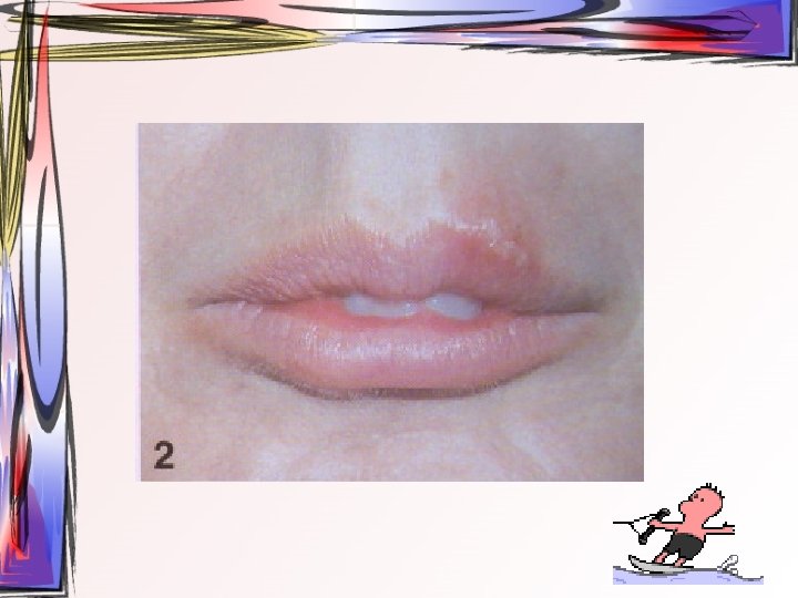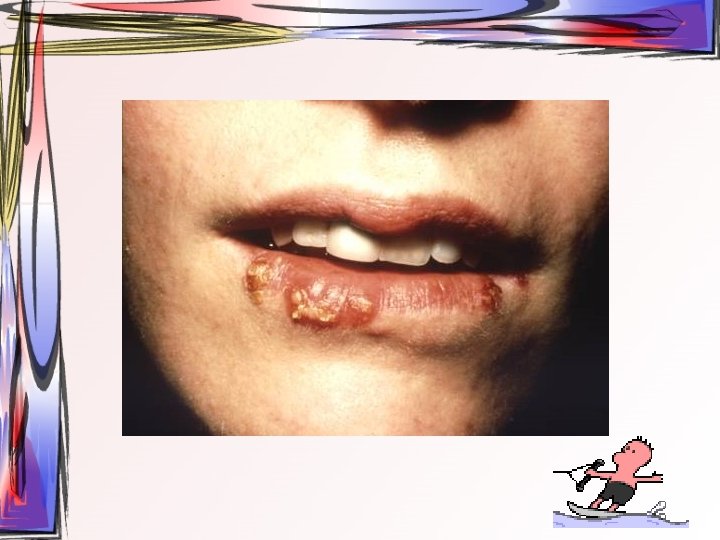 Sekonder (rekürrent) HSV enfeksiyonları • latent virüsün reaktivasyonu • güneş ışığı, soğuk, travma, stres ve bağışıklık sisteminin baskılanması • kaşıntı, yanma veya ağrı gibi prodromal belirtiler görülür • lezyonlar skar oluşmadan kendiliğinden 1 -2 hafta içerisinde iyileşir • rekürrens genellikle aynı bölgede olur ve çoğunlukla vermilyon ve çevre deride • herpes labialis olarak adlandırılır