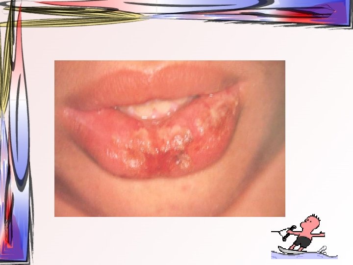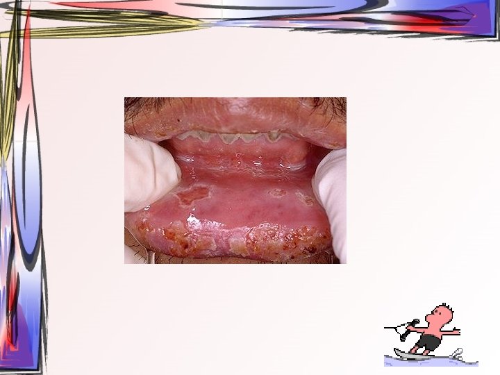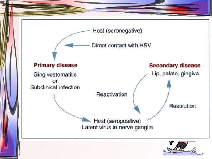 Primer herpetik gingivostomatit • inkübasyon periodu birkaç gün ile iki hafta arasında değişir • primer hastalıkta oral ve perioral dokularda tipik vezikülo ülseratif lezyonlar görülür • genellikle çocuklarda görülür • veziküller deride, vermilyonda veya oral müköz membranda görülebilir
