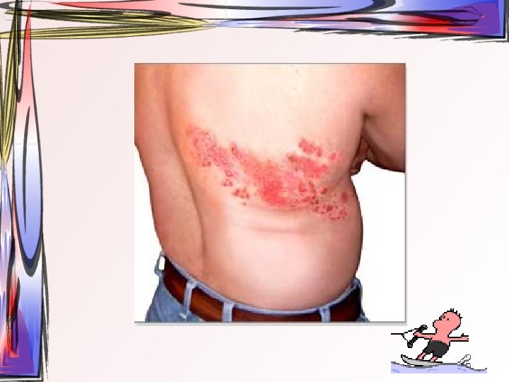Herpes Zoster (Zona Zoster) • Virüsün reaktivasyonu nadirdir • 50 yaşın üstündeki bireylerde, 1 yaşından önce suçiçeği geçirenlerde ve immün sistemi bozuk olan bireylerde daha sık görülür. • genellikle gövde ve baş boyun bölgesindeki duyu sinirleri etkilenir