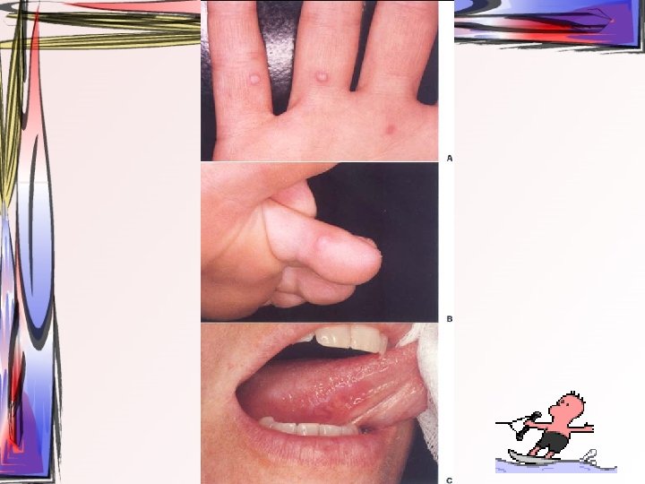EL-AYAK VE AĞIZ HASTALIĞI • Coxsackie virüs tip A (1 -10, 16 ve 22) , • Epidemik (salgın), endemik (sık görülmesi) • fekal-oral kontaminasyon ve damlacık yolu ile bulaşır • 5 yaşından küçük çocukları etkiler • ağız, el ve ayakta veziküller görülür. • Vezikül, takiben ülser, tabanı sarı fibrinöz membranla kaplı ve etrafında eritematöz halka