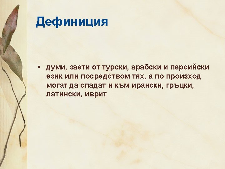 Ориентализми със суфикси -džij-a, -luk, -an-a и -lij-a Пример -an-a Otada se Jakša ulogorio u Zarijevoj mehani. Starica je izvede uza strme basamake i nađoše se na prostranoj divanani, zastrtoj ihramima. To demonstranti valjda prolaze pored samih apsana. U kafani je bilo mirno, gotovo pusto. Četrdeset i dvojica prvaka izuše mestve i čivtijane na basamcima pred Konakom, i posjedaše, po godinama i ugledu, u velikoj dvorani. Брой 173