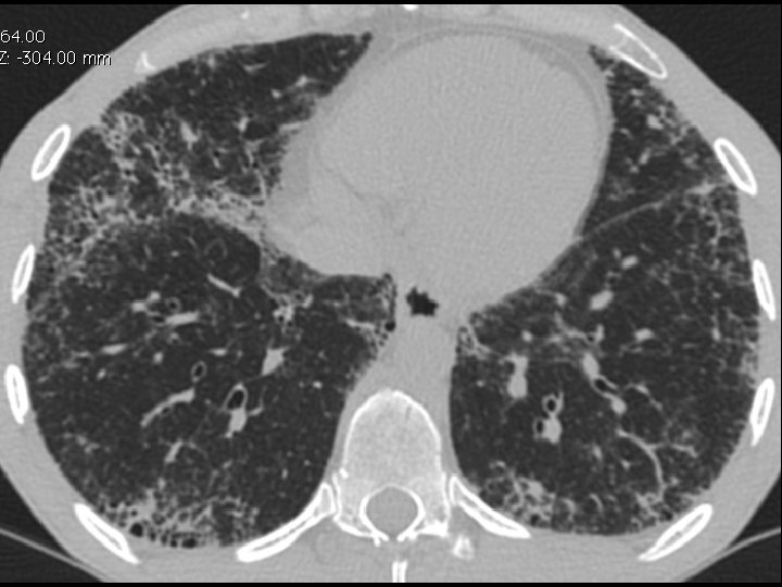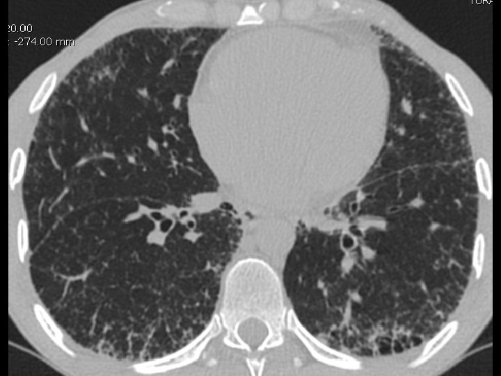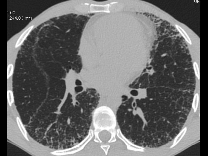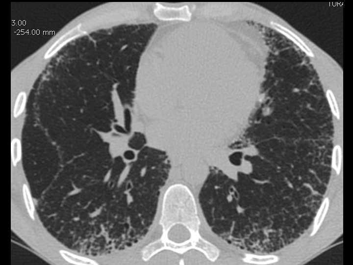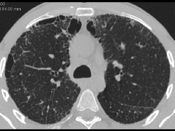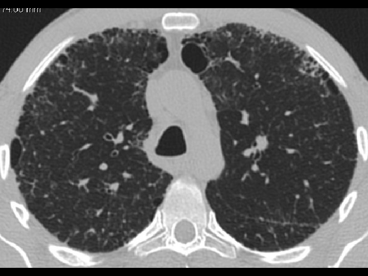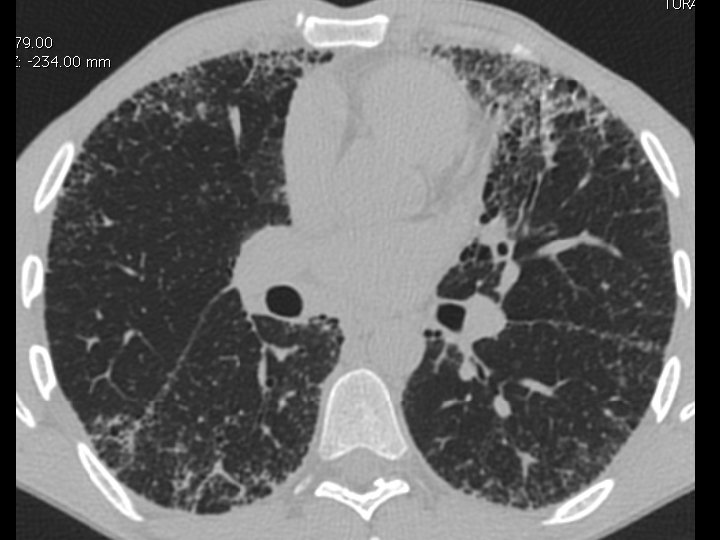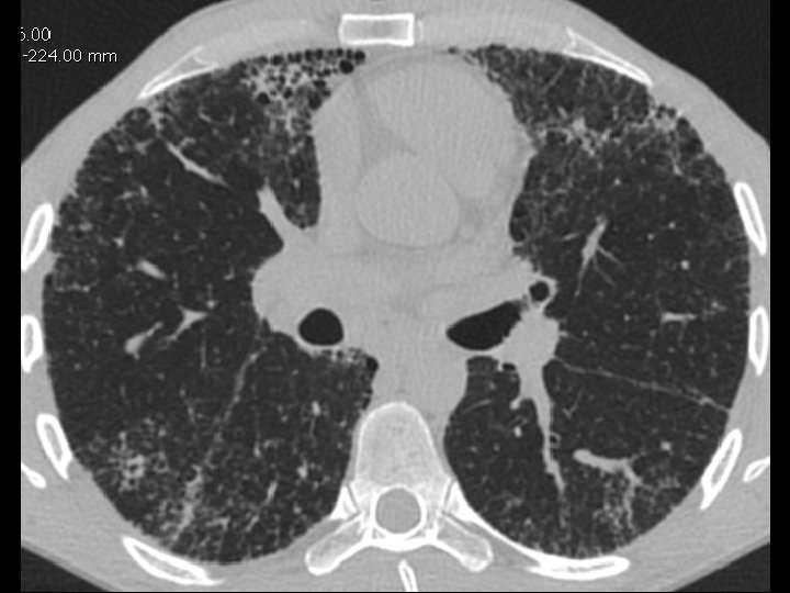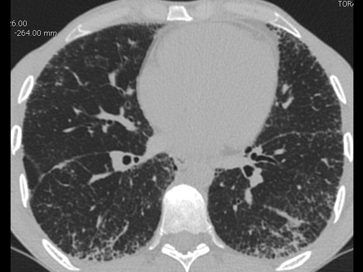 Lung function tests % predicted Arterial blood gases (fi. O 2 21%) FVC 4. 20 L 92. 3 % p. H 7. 42, p. O 2 81. 5 mm. Hg, p. CO 2 37. 9 mm. Hg, FEV 1 3. 81 L 93. 8 % HCO 3 - 24. 8 mmol/L, SO 2 96. 2% FEV 1/FVC 90. 7 % RV 1. 96 L 104. 3 % 6 minute walk test TLC 6. 42 L 96. 4 % Distance 420 meters, with 3% desaturation RV/TLC 30. 5 % (baseline Sp. O 2 93%, minimum 90%) DLCO 40. 4 % DLCO/VA 57. 7 % Initial Borg dyspnea scale 0 final Borg 0