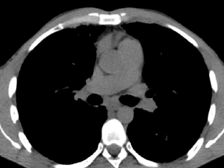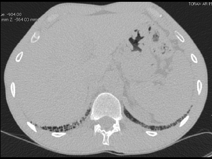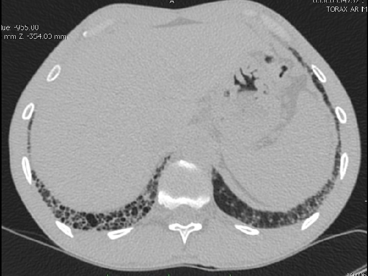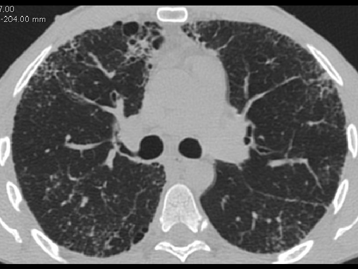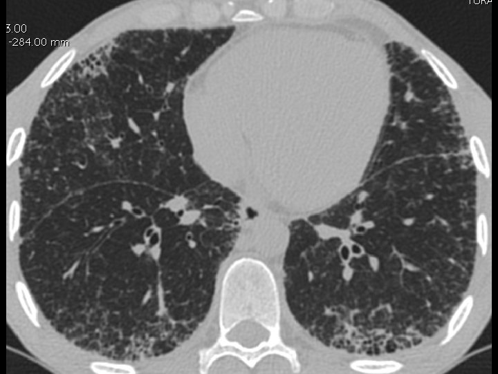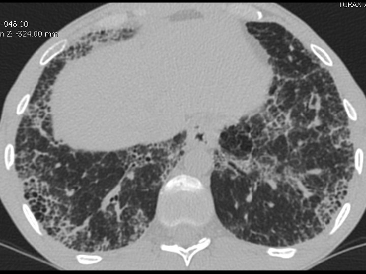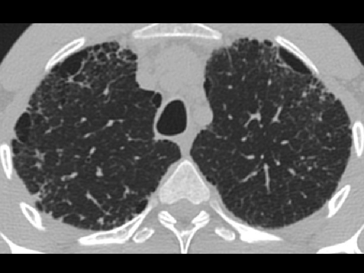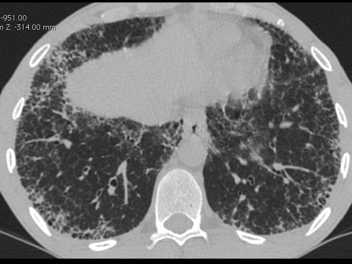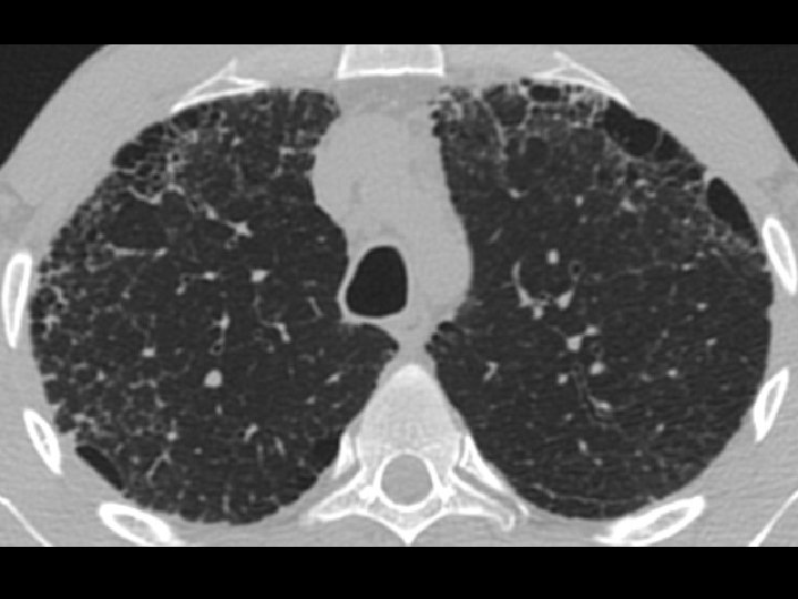 Lung function tests % predicted Arterial blood gases (fi. O 2 21%) FVC 4. 20 L 92. 3 % p. H 7. 42, p. O 2 81. 5 mm. Hg, p. CO 2 37. 9 mm. Hg, FEV 1 3. 81 L 93. 8 % HCO 3 - 24. 8 mmol/L, SO 2 96. 2% FEV 1/FVC 90. 7 % RV 1. 96 L 104. 3 % 6 minute walk test TLC 6. 42 L 96. 4 % Distance 420 meters, with 3% desaturation RV/TLC 30. 5 % (baseline Sp. O 2 93%, minimum 90%) DLCO 40. 4 % DLCO/VA 57. 7 % Initial Borg dyspnea scale 0 final Borg 0