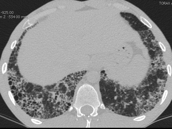 39 yo caucasian male, works in car collision repair and painting Multiple allergies, Gastroesophageal reflux disease and Thrombocytopenia of unknown etiology Smoker. No drugs CT: Reticular abnormality and honeycombing of subpleural basal predominance + micronodules Lung function tests: decreased diffusion capacity of the lung Blood tests: small increase of ESR and CRP; Autoimmune screening blood tests were normal BAL: normal celularity, with a mild increase in the neutrophil and eosinophil count
