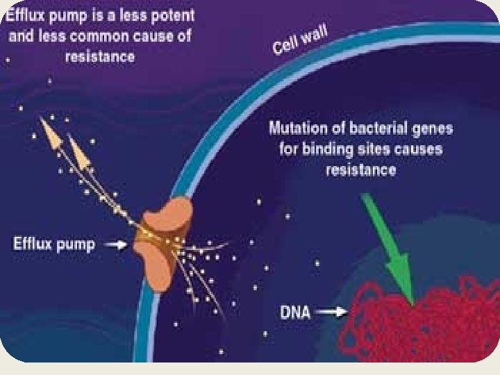 Mechanism of resistance • Resistance to quinolones may develop during therapy via mutations in the bacterial chromosomal genes encoding DNA gyrase or topoisomerase IV, or by active transport of the drug out of the bacteria. • Mechanism of resistance: – Chromosomal: 1 Alter target enzymes: DNA gyrase and topoisomerase IV 2 Decreased drug penetration (Efflux pump): Pseudomonas, E. coli – Plasmid: seen in some K. pneumoniae and E. coli – Mutations in both target enzymes are needed to produce significant resistance