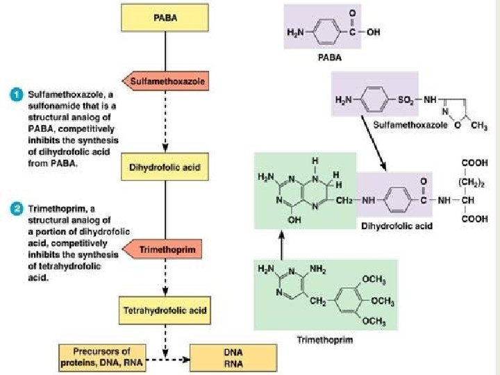 Sulfa mode of action • Antibacterial sulfonamides kill bacteria and fungi by interfering with their metabolism targeting their metabolic pathway as competitive inhibitors of the enzyme dihydropteroate synthetase, DHPS. Dihydropteroate synthetase activity is essiantial in the synthesis of folate, and folate is required for cells to make nucleic acids, such as DNA or RNA. So if DNA molecules cannot be built, the cell cannot divide, • the effect is bacteriostatic (rather than bactericidal) unless one of sulfa derivatives is mixed with trimethoprim in this condition it will be bacteriocidal . ﺍﻟﻤﺴﺎﺭ ﻋﻦ ﻛﺎﻣﻠﺔ ﺍﻟﺘﻔﺎﺻﻴﻴﻞ ﻓﻴﻬﺎ ﺍﻟﺴﺎﺑﻘﺘﻴﻦ ﺍﻟﻤﺤﺎﺿﺮﺗﻴﻦ ﺭﺍﺟﻊ ﻭﺍﻟﺘﺜﺒﻴﻄﻲ ﺍﻻﻳﻀﻲ • Because sulfa drugs concentrate in the urine before being excreted, treating urinary tract infections is one of their most common uses . • Sulfa drugs do not cause the same disruption in animal cells, because our cells do not synthesize folate. Since we can’t make folate, we need to consume it, and folate is a dietary requirement.