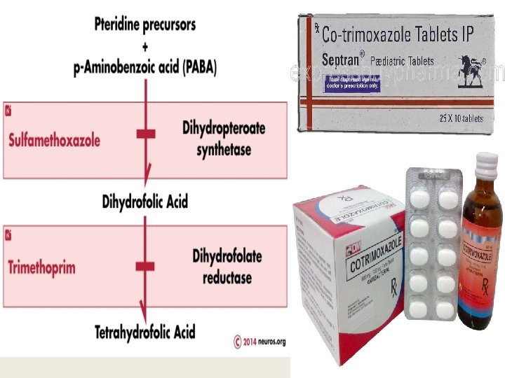 Examples of Sulfonamides : co –trimoxazole bactericidal It is a combination between Trimethoprim (one part) / sulfamethoxazole (five parts ) ( ﺍﻧﺘﺒﻪ ﻟﻨﺴﺒﺔ ﺍﻟﺨﻠﻂ ﻣﻬﻤﻪ TMP/SMX), also known as co-trimoxazole , is an antimicrobial agent used to treat a variety of bacterial infections. It is used for urinary tract infections ﺧﻂ ﺍﻟﺒﻮﻟﻴﺔ ﺍﻟﻤﺠﺎﺭﻱ ﻻﻟﺘﻬﺎﺏ ﺍﻭﻝ ﻋﻼﺟﻲ , MRSA skin infections, travelers' diarrhea, respiratory tract infections, and cholera. It may be used both to treat and prevent pneumocystis pneumonia in people with HIV/AIDS. It can be given by mouth or intravenously. Common side effects : include nausea, vomiting, rash, and diarrhea. Severe allergic reactions and Clostridium difficile diarrhea may occasionally occurs. Because sulfonamides displace bilirubin from albumin, kernicterus (brain damage due to excess bilirubin) is an important potential side effect of sulfonamide