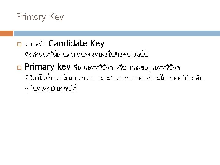 ตวอยาง Table แตไมใช Relation Employee. Number First. Name Last. Name Department Email Phone 100 Jerry Johnson Accounting JJ@somewhere. com 236 -9987 200 Mary Abernathy Finance MA@somewhere. com 444 -8898 300 Liz Smarthers Finance LS@somewhere. com 777 -0098 400 Tom Caruthers Accounting TC@somewhere. com 236 -9987 , 266 -9987 , 555 -7171 500 Tom Jackson Production TJ@somewhere. com 444 -9980 600 Eleanore Caldera Legal EC@somewhere. com 767 -09000 700 Richard Bandalone Legal RB@somewhere. com 767 -0900 , 767 -0011