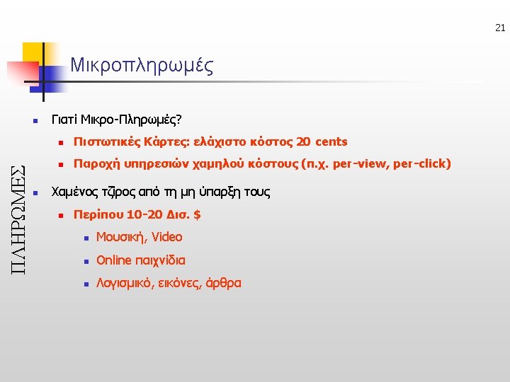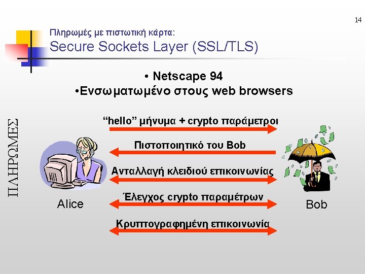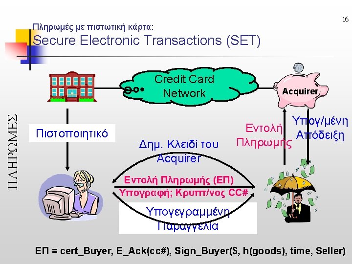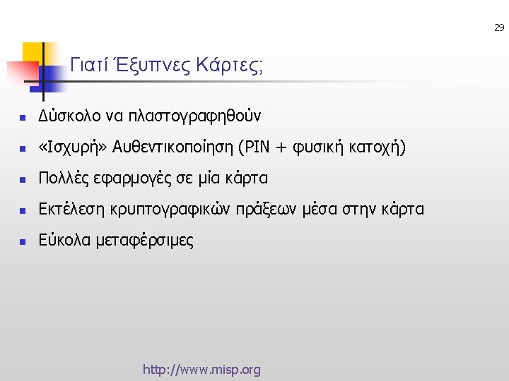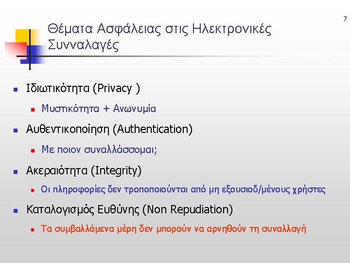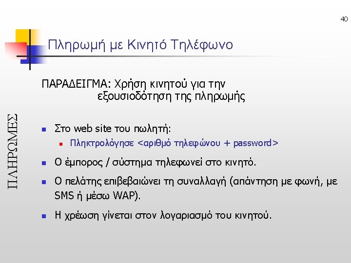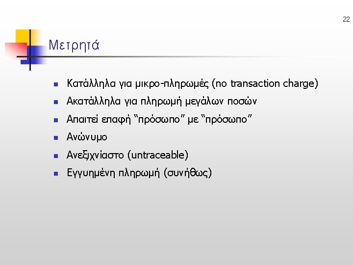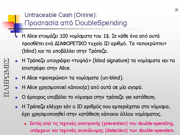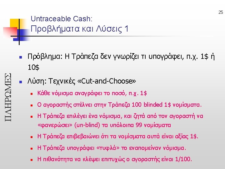 23 Untraceable e-Cash (Ανεξιχνίαστα Ηλ. Μετρητά) • Online: ecash, Offline: CAFE ΠΛΗΡΩΜΕΣ Issuer Acquirer sign untraceable Check Issuer’s signature ή Buyer Merchant anonymously