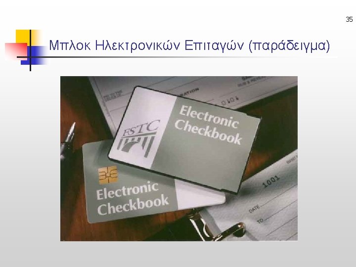 33 Ηλεκτρονικές Επιταγές – Αρχιτεκτονική (Γενικά) Payer Write Echeck, Sign Payee Verify Signatures, Endorse, Write Deposit, Sign E-Mail or WWW Echeck Endorsed E-Mail Echeck Deposit Clear and Settle Echeck Verify Signatures, Debit Echeck Verify Signatures, Credit Deposit Endorsed Echeck Payer’s Bank Payee’s Bank