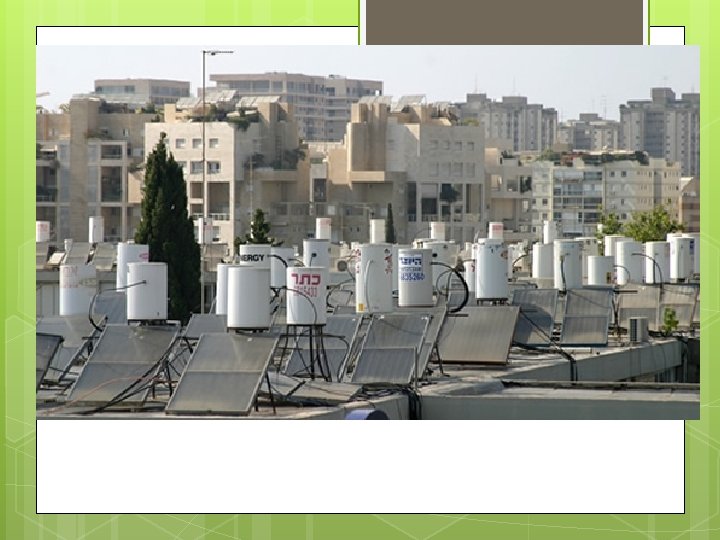 Active systems • • • Water pipes on roof heat up. Water brought down into heat exchanger in house which warms the shower water. Cooled water pumped back to roof to warm up. • Can also be used to heat a house with radiators.