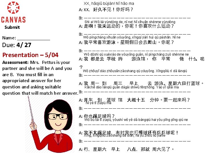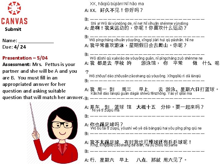 Presentation: 5/04 Direction: Mrs. Pettus is your partner, you will form a conversation and record back to me about your favorite sport, and your past time activities. Please be detail and add some story or background to your answer. I will record myself and you will response my question. Requirements: 1. No English or note when you presenting 2. You will have 3 - 5 mi. 3. Must include at least 5 questions words: 什么,为什么,哪里,什么时候, 谁, and A 不A,吗,怎么样 (only five must include in your conversation) 4. Can not have one student asking all the question and the other student answer all 5. At least 4 -5 lines for each student, greeting is not include in your conversation. 6. Graded is based on: Comprehension, Vocabulary, Fluency and Grammar. 7. Please see website for grading criterial. 8. You also can include the following phrases 1. 运动 yùndòng- do sport 2. 平常 píng cháng –usually 3. 不常 Bù cháng– not often 4. 还是 háishì- still is 5. 都是/ 都不是dōu shì/ dōu bùshì 6. 每 měi - every 7. 比较 bǐjiào- relatively 8. 有时 yǒushí -sometimes 9. 假日 Jiàrì –weekend, holiday 10. 比赛 bǐsài- game, to compete 11. Adj. 极了/ Adj. 死了 12. 觉得 Juédé – to feel 13. 近来 jìnlái – recently, lately 14. 约 yuē- appoint, approx. 15. 大概 dàgài-probably