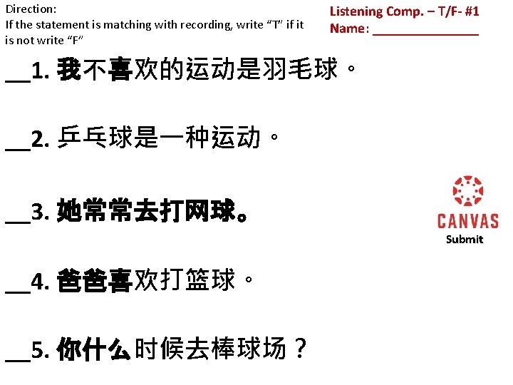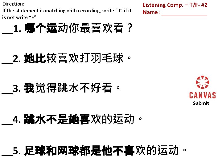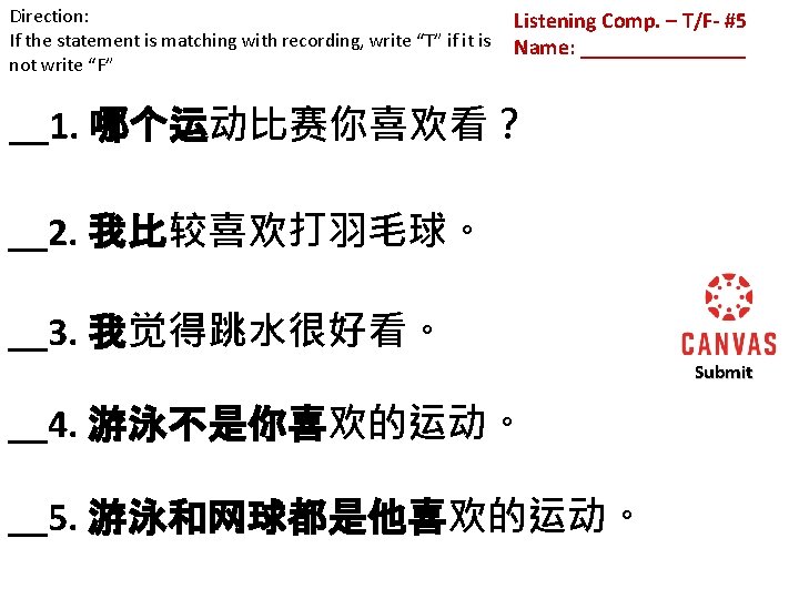 Direction: Listen the question and answer it in Chinese. Please use a complete sentence. Submit your answer on Canvas. Speaking Comp. - #3 Click and play Nǐ bù xǐhuān shénme yùndòng 1. 你不喜欢什么运动? Nǐ píngcháng huì qù dǎ wǎngqiú ma 2. 你平常会去打网球吗? Nǐ shénme shíhòu qù kàn qiúsài 3. 你什么时候去看球赛? Submit