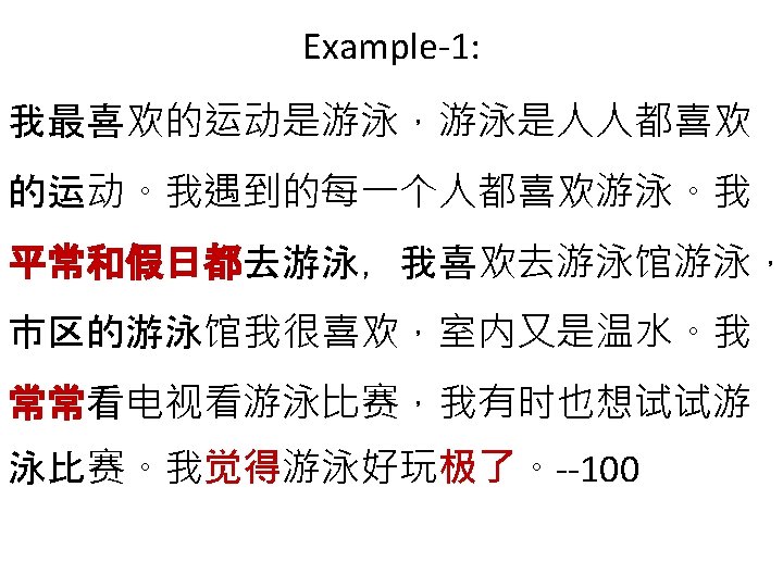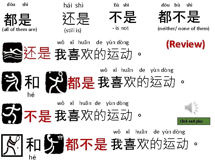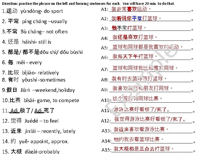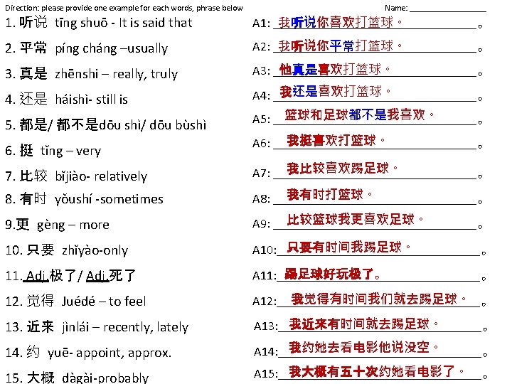 Direction: please provide one example for each words, phrase below Name: _________ 1. 运动 yùndòng- do sport A 1: ________________。 2. 平常 píng cháng –usually A 2: ________________。 3. 不常 Bù cháng– not often A 3: ________________。 4. 还是 háishì- still is A 4: ________________。 5. 都是/ 都不是dōu shì/ dōu bùshì A 5: ________________。 6. 每 měi - every A 6: ________________。 7. 比较 bǐjiào- relatively A 7: ________________。 8. 有时 yǒushí -sometimes A 8: ________________。 9. 假日 Jiàrì –weekend, holiday A 9: ________________。 10. 比赛 bǐsài- game, to compete A 10: ________________。 11. Adj. 极了/ Adj. 死了 A 11: ________________。 12. 觉得 Juédé – to feel A 12: ________________。 13. 近来 jìnlái – recently, lately A 13: ________________。 14. 约 yuē- appoint, approx. A 14: ________________。 15. 大概 dàgài-probably A 15: ________________。