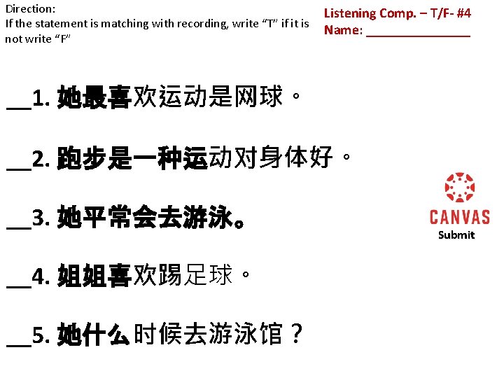 Direction: Listen the question and answer it in Chinese. Please use a complete sentence. Submit your answer on Canvas. Speaking Comp. - #1 Click and play Nǐ zuì xǐhuān shénme yùndòng 1. 你最喜欢什么运动? Nǐ cháng yùndòng ma 2. 你 常常 运动 吗? Nǐ píngcháng huì qù nǎlǐ yóuyǒng 3. 你平常会去哪里游泳? Submit