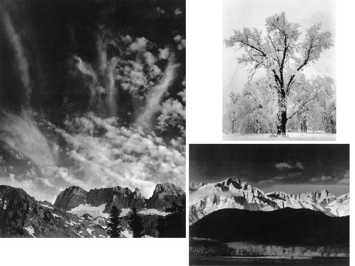 Vida… • Ansel Easton Adams nació el 20 de febrero de 1902 (San Francisco, California). Fue considerado fotógrafo y ecologista. • Hijo único de Charles Hitchcock Adams y Olive Bray, creció en un ambiente Victoriano (social y conservador). Pese a ser inteligente, era muy tímido, lo que, unido a la dislexia que padecía, le causó ciertos problemas al intentar integrarse en la escuela. • Ansel Adams luchó durante toda su vida por defender y proteger la naturaleza. Estudió piano durante varios años, lo que le dio disciplina y estructura. Se inició en la fotografía utilizando una cámara Kodak #1 Box Brownie que le dieron sus padres. Se unió a un club donde conoció a su esposa, Virginia Best, y se casaron en 1928, engendrando a 2 hijos. En 1930, Ansel Adams conoció al fotógrafo Paul Strand. Sus imágenes tuvieron un gran impacto en Adams, ayudándolo a alejarse del estilo pictorialista y a encaminarse hacia el estilo de “straight photography”, donde la claridad de la lente es lo más importante, y donde la fotografía ha de sufrir el menor número de ajustes y retoques posible. • En 1927 Ansel Adams conoció a Edward Weston, con quien entabló una gran amistad. Juntos, Adams, Strand, Cunningham y Weston formaron un grupo llamado "f/64" en 1932. Éste grupo promovió y evolucionó “straight photography”. • Adams fue destacando cada vez más por su energía y entusiasmo. Visitó por primera vez Nueva York en 1933 y conoció a Alfred Stieglitz, un fotógrafo al que siempre había admirado. Stieglitz le ayudó a hacer su primera exposición. • Murió el 22 de abril de 1984, debido a un fallo en el corazón, posiblemente agravado por un cáncer pancreático.
