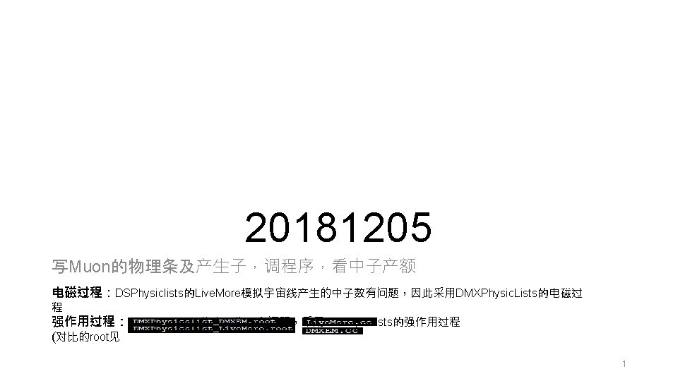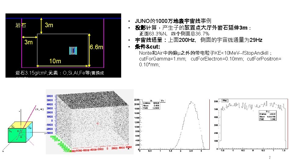 400 Muon100000020181116 root Muon1000000201811191 root Muon100000020181120 root 400flux Slides: 6 Download presentation 400万事例: Muon_1000000_20181116. root Muon_1000000_20181119_1. root Muon_1000000_20181120. root 400万事例,穿过外层液氩flux= 17531 内层液氩flux= 5966 realtime 132 s:上面 63. 6%*400 W/(200 Hz*16 m) =49. 7 s 侧面 36. 7%*400 W/(29 Hz*16 m*9. 6 m*4) = 82. 4 s 挑选条件:pre. Step≠Active. LAr; post. Step=Active. LAr pre. Step≠LAr; post. Step=LAr(穿过即计数) Scale后:宇宙线通量外层液氩 132 Hz,内层液氩 45 Hz 中子通量:(last. Track. ID≠track. ID) (重复计数) neutron flux in Cryo*=4427 neutron_flux in LAr=3273 neutron_flux in Active. LAr=1510 Scale后:中子通量外层液氩 24. 8 Hz,内层液氩 11. 4 Hz Active. LAr中 1510个中子物理过程: 8840次 1091 传播 108次 4121 非弹散射 3次 4131 n. Capture 死时间(假设veto 100%):E: 220 v/cm,Tdrift: 1 ms, dead_time: 13. 2% 3 20181102/Muon_1000000_20181127. root μ在 3 m岩石中子的产额(去掉重复trak. ID & 非弹重复计数 & μ传到 3 m岩石外kill) Neutron_Create_Rock=103265 为: 0. 10/μ 理论产额: 0. 023/μ(7. 5 Ge. V) PHYSICAL REVIEW D, VOLUME 64, 013012 4
