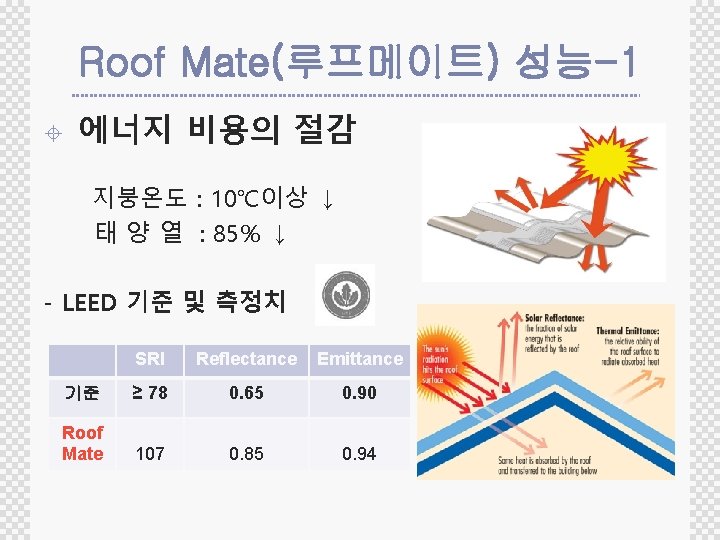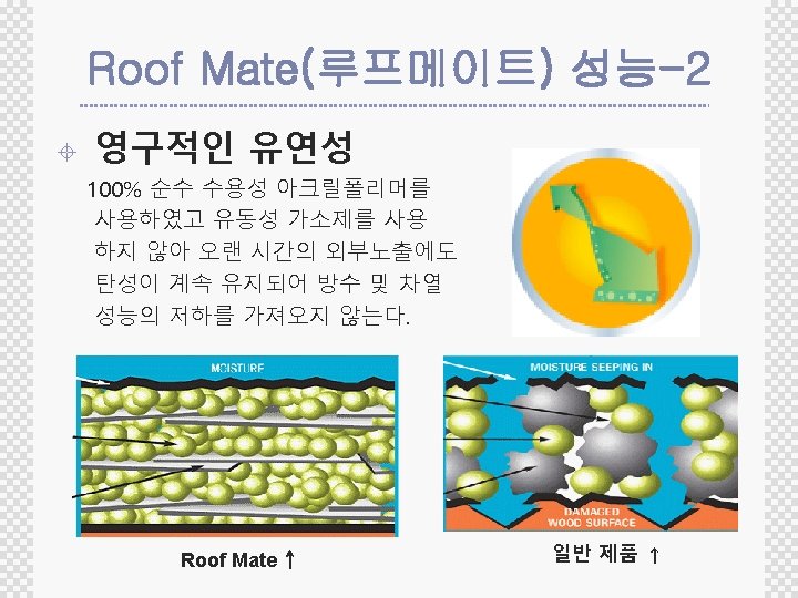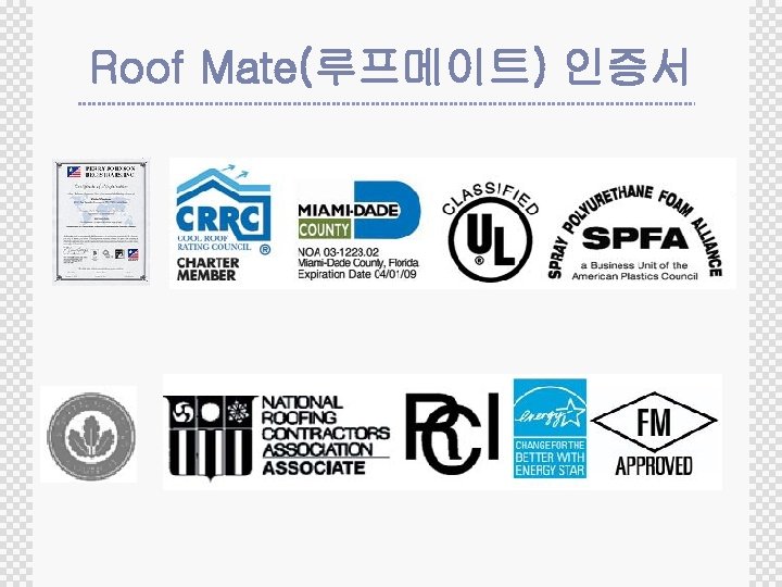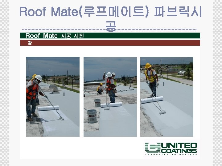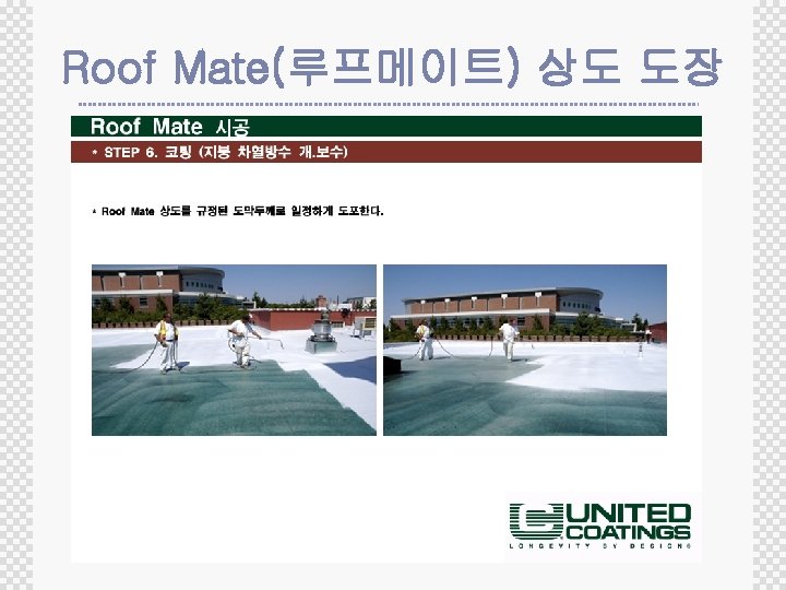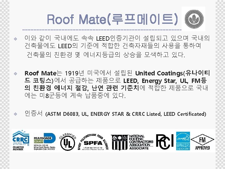 History - 1919년 미국 United Coatings 창립 - 1920년 지붕용, 건축용, 산업용 제품 생산 - Elastomeric Polymer Chemistry and Protective Coatings Technology 연구소 - ISO 9001: 2008 and ISO 14001: 2004 인증 - 미국 환경보호협회 “Evergreen Award”수상 - 미국 환경부 “Pollution Prevention Award” , “Best Business Award” 수상