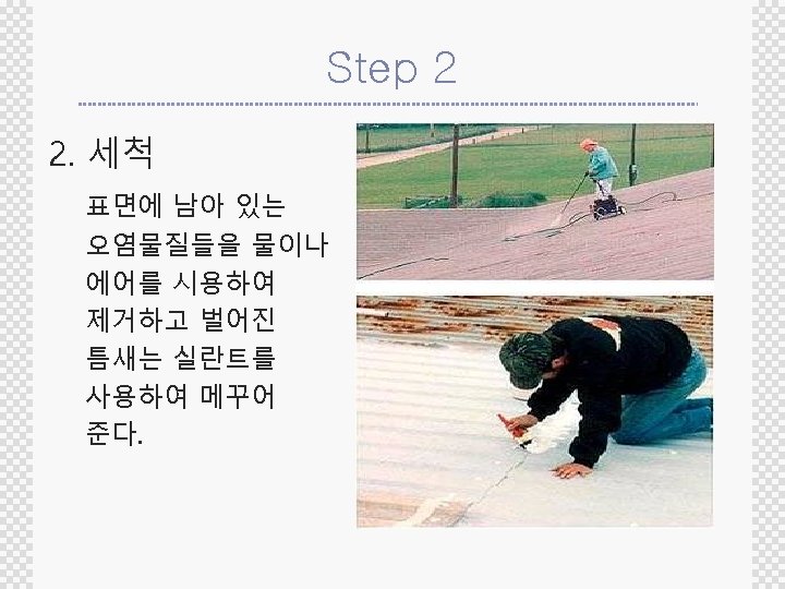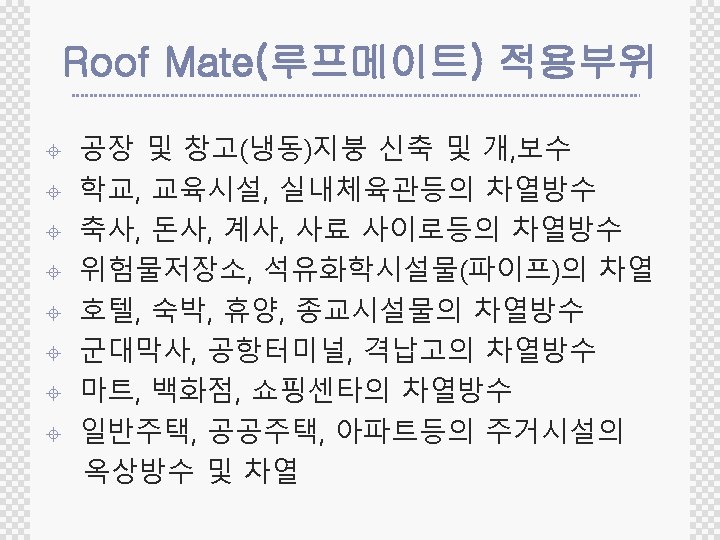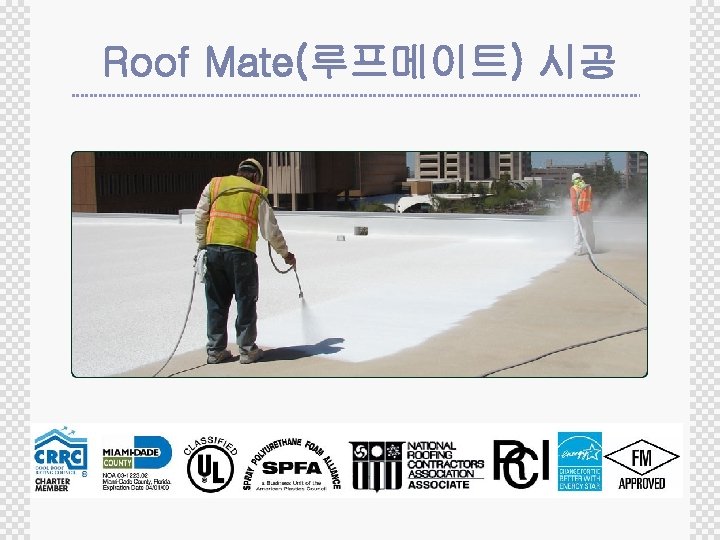 Roof Mate(루프메이트) 주요실적 2 ± ± ± JC Penney Co. Warehouse Lodi Community Church Lufthanza Cargo Hanger National Nuclear Corporation National Semiconductor Oakland Army Base Orbit Semiconductor Roche Pharmaceutical Shell Chemical U. S. Naval Station Warner Brothers Studios