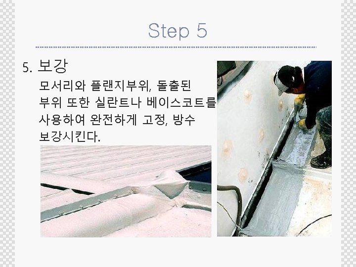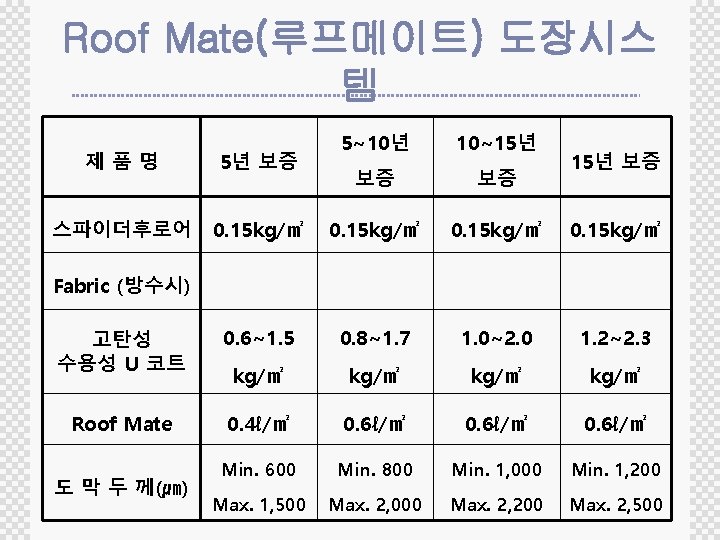 Roof Mate(루프메이트) 주요실적 4 ± Kellogg Animal Hospital Pizza Pipeline Midwest Electric Purdue University Kansas University Heinz Co. Dow Chemical Owens Corning외 다수 (미국) Canon외 (일본) Siemens외 (멕시코) 성남비행장, 미 8군기지 ± 서울 강남파이넨스센타, 서울 잠원한신 16차 아파트옥상등 ± ± ± ± ±