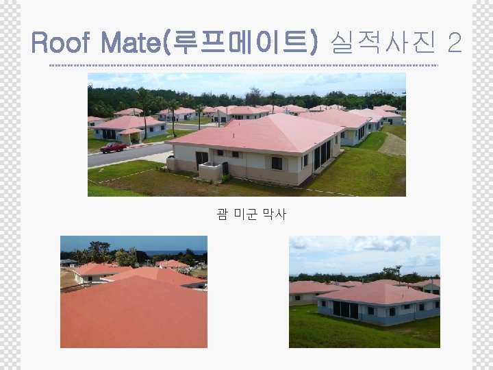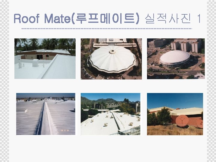 Roof Mate(루프메이트)주요실적 1 ± ± ± Arizona Biltmore Hotel Bush Elementary School Canyon Place Apartment City of Phoenix Civic Plaza Intel Motorola Max Steel American Airline Airport Terminal Coca Cola Dupont Hewlett Packard
