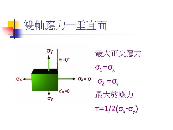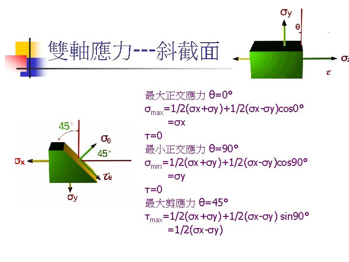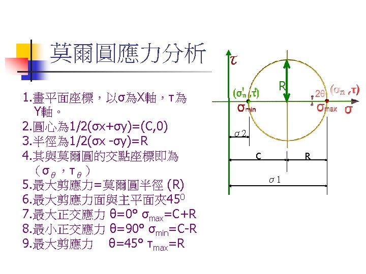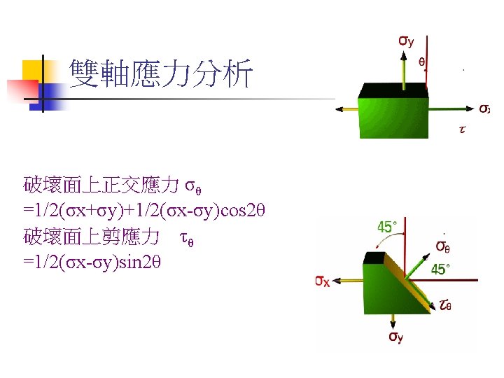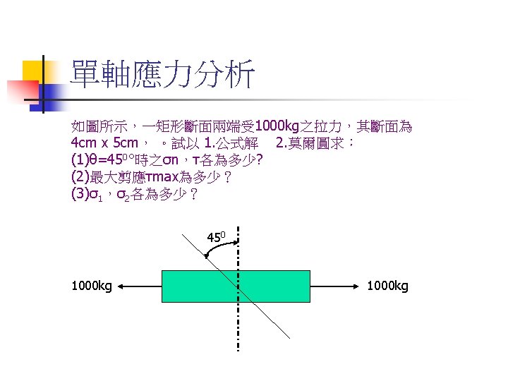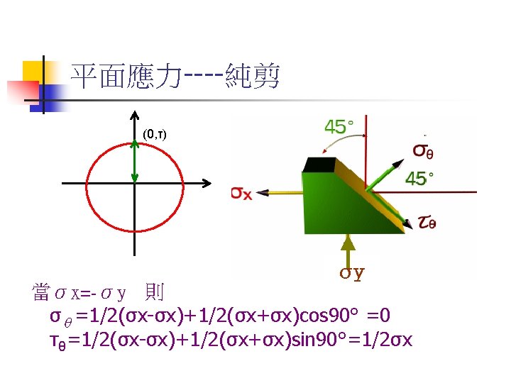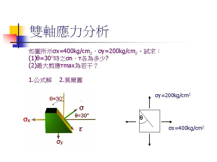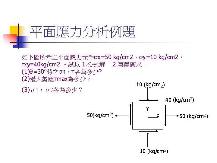 450 1000 kg 450 x x x10004 x Slides: 29 Download presentation 公式解 450 1000 kg θ=450 莫爾圓解 σx σx σx=1000/(4 x 5)=50 圓心座標=1/2(50+0)=25 (σ, τ)=(25, 0) 半徑 r=1/2(50 - 0)=25 τ r=25 (σθ, τθ) 1. σθ=25 (kg/cm 2) τθ=25 (kg/cm 2) 2θ=900 (25, 0) 2. σ1=50(kg/cm 2) σ2=0(kg/cm 2) τmax=25(kg/cm 2) σ1=50 (50, 0) σ 200 平面應力公式解 σx θ=300 σy σθ=1/2(σx+σy)+1/2(σx-σy) cos 2θ =1/2(400+200)+1/2(400 -200) cos(2 x 30°) =350 (kg/cm 2) τθ=1/2(σx-σy)sin 2θ =1/2(400 -200) sin(2 x 30°) =50√ 3 (kg/cm 2) θ=45° τmax=1/2(σx-σy) =1/2(400 -200) =100(kg/cm 2) 400 200 θ=300 莫爾圓解 400 τ 圓心座標=1/2(400+200)=300 (σ, τ)=(300, 0) 半徑r=1/2(400 -200)=100 (350, 50√ 3) 1. σn=300+100 cos 60° =350(kg/cm 2) τ=100 sin 60°=50√ 3(kg/cm 2) 2θ=600 =200 (300, 0) 2. 最大剪應力 θ=45° τmax=r =100(kg/cm 2) =400 σ 10 40 公式解 θ=300 σn=1/2(σx+σy)+1/2(σx-σy) cos 2θ-τxysin 2θ =1/2(50+(-10))+1/2(50 -(-10)) cos 2 x 30°-40 sin 2 x 30° =0. 359(kg/cm 2) τ=1/2(σx-σy)sin 2θ+ τxysin 2θ =1/2(50 -(-10)) sin 2 x 30°-40 sin 2 x 30° =45. 981(kg/cm 2) θ=45° τmax= (kg/cm 2) 50 10 40 θ=300 莫爾圓解 τ 圓心座標=1/2(50+(-10))=20 (σ, τ)=(20, 0) 半徑r=√(302+402)=50 α=tan-1(40/30)=53. 130 1σθ=20 -50 xcos 66. 870 =0. 359(kg/cm 2) τθ=50 sin 66. 87°=45. 981(kg/cm 2) σ2=20 -50=-30 r=50 σ2=30 (σn , τ ) 2. 最大剪應力 θ=45° τmax=r =50(kg/cm 2) σ1=20+50=70 50 2θ=600 (20, 0) (10 , 40) =20 σ1=70 (50 , 40) α=53. 130 σ
