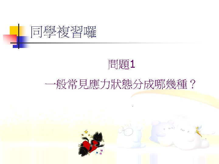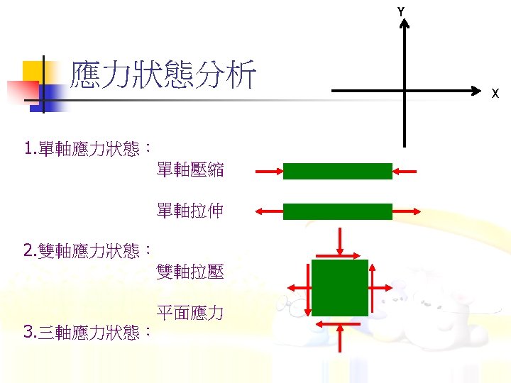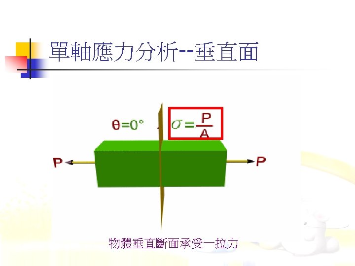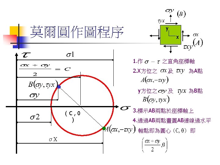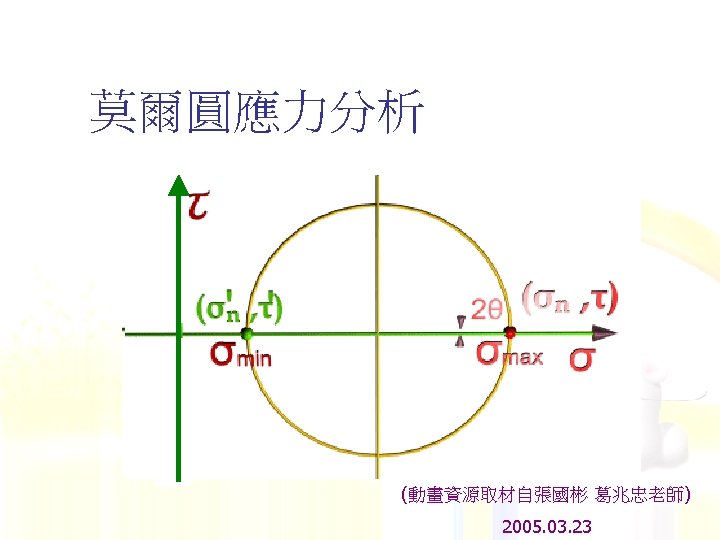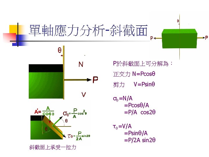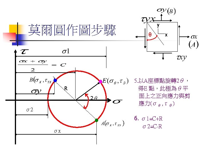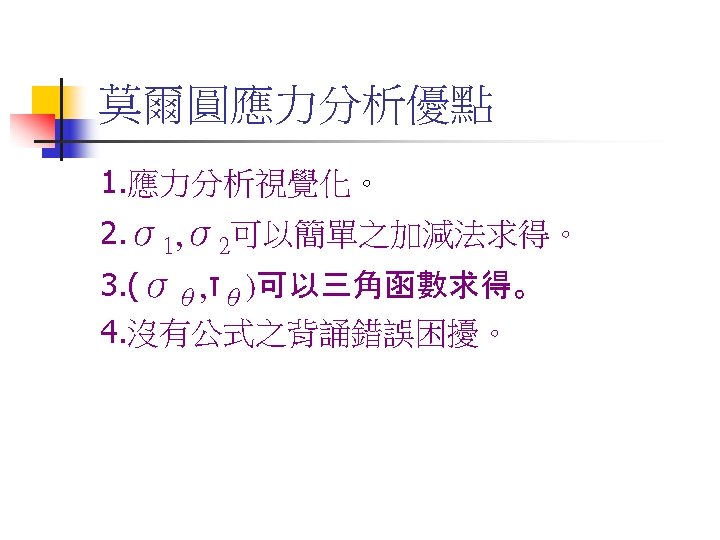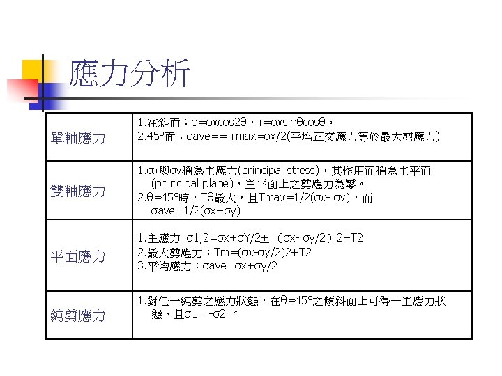 450 1000 kg 450 x x x10004 x Slides: 29 Download presentation 公式解 450 1000 kg θ=450 莫爾圓解 σx σx σx=1000/(4 x 5)=50 圓心座標=1/2(50+0)=25 (σ, τ)=(25, 0) 半徑 r=1/2(50 - 0)=25 τ r=25 (σθ, τθ) 1. σθ=25 (kg/cm 2) τθ=25 (kg/cm 2) 2θ=900 (25, 0) 2. σ1=50(kg/cm 2) σ2=0(kg/cm 2) τmax=25(kg/cm 2) σ1=50 (50, 0) σ 200 平面應力公式解 σx θ=300 σy σθ=1/2(σx+σy)+1/2(σx-σy) cos 2θ =1/2(400+200)+1/2(400 -200) cos(2 x 30°) =350 (kg/cm 2) τθ=1/2(σx-σy)sin 2θ =1/2(400 -200) sin(2 x 30°) =50√ 3 (kg/cm 2) θ=45° τmax=1/2(σx-σy) =1/2(400 -200) =100(kg/cm 2) 400 200 θ=300 莫爾圓解 400 τ 圓心座標=1/2(400+200)=300 (σ, τ)=(300, 0) 半徑r=1/2(400 -200)=100 (350, 50√ 3) 1. σn=300+100 cos 60° =350(kg/cm 2) τ=100 sin 60°=50√ 3(kg/cm 2) 2θ=600 =200 (300, 0) 2. 最大剪應力 θ=45° τmax=r =100(kg/cm 2) =400 σ 10 40 公式解 θ=300 σn=1/2(σx+σy)+1/2(σx-σy) cos 2θ-τxysin 2θ =1/2(50+(-10))+1/2(50 -(-10)) cos 2 x 30°-40 sin 2 x 30° =0. 359(kg/cm 2) τ=1/2(σx-σy)sin 2θ+ τxysin 2θ =1/2(50 -(-10)) sin 2 x 30°-40 sin 2 x 30° =45. 981(kg/cm 2) θ=45° τmax= (kg/cm 2) 50 10 40 θ=300 莫爾圓解 τ 圓心座標=1/2(50+(-10))=20 (σ, τ)=(20, 0) 半徑r=√(302+402)=50 α=tan-1(40/30)=53. 130 1σθ=20 -50 xcos 66. 870 =0. 359(kg/cm 2) τθ=50 sin 66. 87°=45. 981(kg/cm 2) σ2=20 -50=-30 r=50 σ2=30 (σn , τ ) 2. 最大剪應力 θ=45° τmax=r =50(kg/cm 2) σ1=20+50=70 50 2θ=600 (20, 0) (10 , 40) =20 σ1=70 (50 , 40) α=53. 130 σ