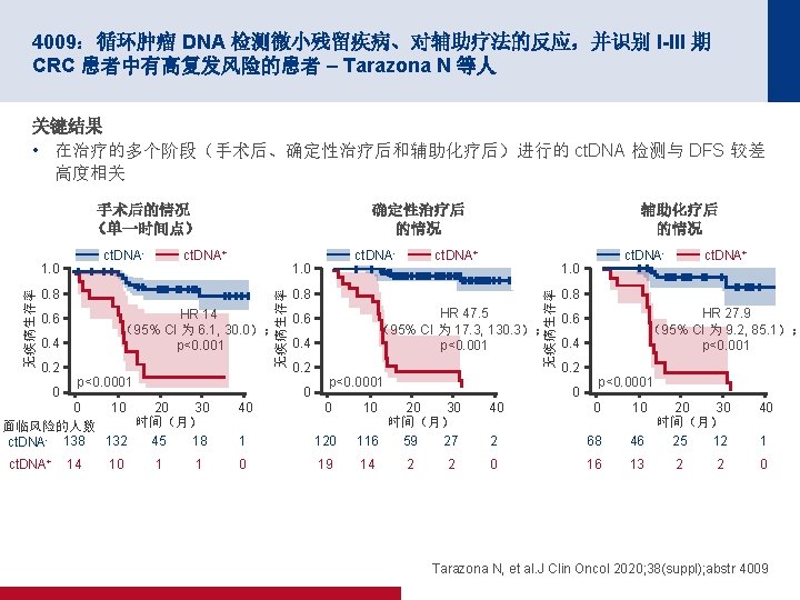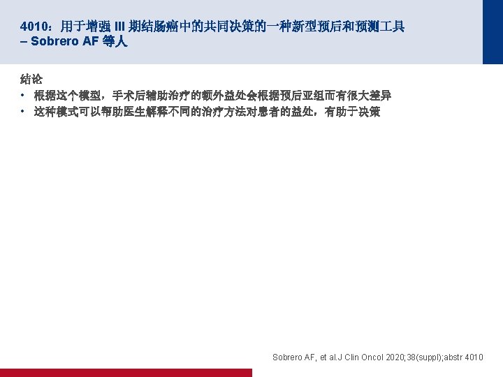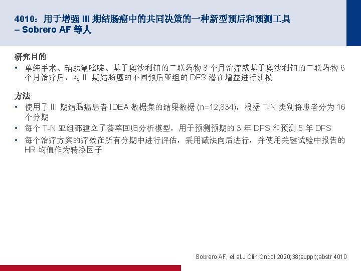 4010:用于增强 III 期结肠癌中的共同决策的一种新型预后和预测 具 – Sobrero AF 等人 关键结果 不同预后类别中 III 期结肠癌患者的 5 年 DFS(按照治疗) 100 80 0, 8 2, 3 5, 6 0, 9 2, 6 6, 3 1 2, 9 7 1, 1 3, 2 7, 7 1, 3 3, 7 3, 8 8, 9 单纯手术 单独使用 FP 1, 4 4, 1 9, 7 60 40 20 79, 6 76, 8 FU + Oxa 3 m 1, 5 4, 5 10, 4 1, 8 1, 9 2 5, 3 5, 4 5, 5 11, 7 5, 6 12 12, 1 12, 3 6, 1 12, 8 74. 1 70, 7 65, 4 65, 2 61, 2 FU + Oxa 6 m 2, 2 2, 3 2, 4 6, 5 6, 6 13 57, 6 48, 6 46, 6 45, 8 44 37, 3 29, 4 13 2, 5 6, 4 11, 2 26, 8 13, 9 0 T 1 N 1 a T 2 N 1 a T 1 N 1 b T 2 N 1 b T 3 N 1 a T 1 N 2 a T 2 N 2 a T 3 N 1 b T 1 N 2 b T 3 N 2 a T 4 N 1 a T 2 N 1 b T 4 N 1 b T 3 N 2 b T 4 N 2 a T 4 N 2 b • 根据预后亚组,采用最大限度辅助治疗时 5 年 DFS 在 34. 0% 和 88. 3% 之间变化;对于单纯手术治疗,5 年 DFS 在 13. 9% 和 79. 6% 之间变化。 • 根据预后亚组,最大限度辅助治疗的绝对附加益处在 8. 7% 到 22. 0% 之间 Sobrero AF, et al. J Clin Oncol 2020; 38(suppl); abstr 4010