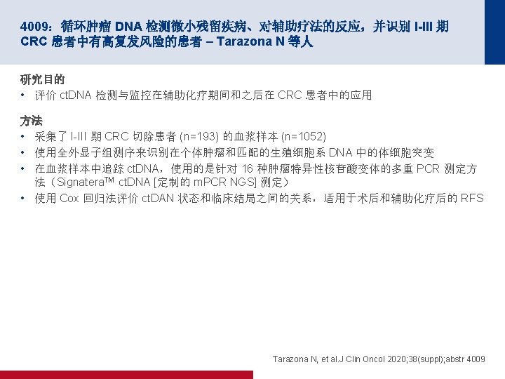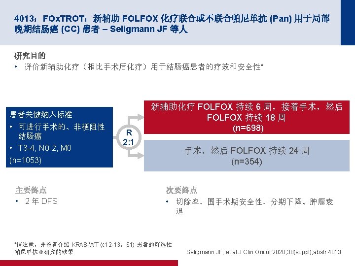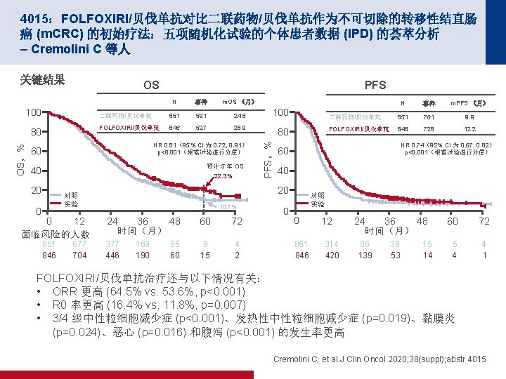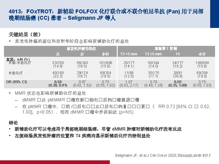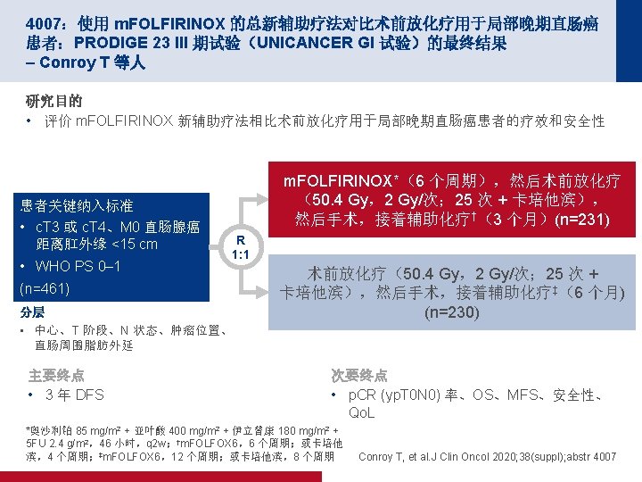 4007:使用 m. FOLFIRINOX 的总新辅助疗法对比术前放化疗用于局部晚期直肠癌 患者:PRODIGE 23 III 期试验(UNICANCER GI 试验)的最终结果 – Conroy T 等人 关键结果 DFS MFS 80 80 MFS,% 100 DFS, % 100 60 m. FOLIFIRNOX (n=231) 40 3 年 DFS,% (95% CI) 20 6 0. 034 12 18 40 3 年 MFS,% (95% CI) 20 0. 69 (0. 49, 0. 97) p值 0 m. FOLIFIRNOX (n=231) 75. 7 (69. 4, 80. 8) 68. 5 (61. 9, 74. 2) HR (95% CI) 0 CRT (n=230) 60 24 30 36 42 48 54 60 78. 8 (72. 7, 83. 7) 71. 7 (65. 3, 77. 2) HR (95% CI) 0. 64 (0. 44, 0. 93) p值 0 0 6 CRT (n=230) 0. 017 12 18 24 30 36 42 48 54 60 时间(月) 面临风险的人数 231 217 210 194 176 150 126 104 80 62 51 231 218 212 200 184 156 131 109 86 65 52 230 201 188 177 167 146 117 91 65 55 40 230 202 191 178 170 153 123 96 70 60 43 Conroy T, et al. J Clin Oncol 2020; 38(suppl); abstr 4007