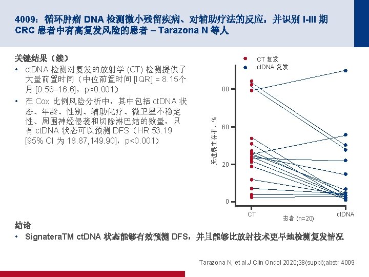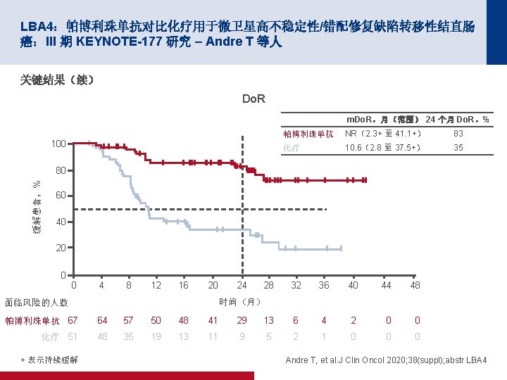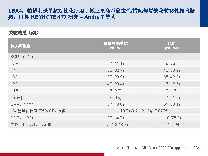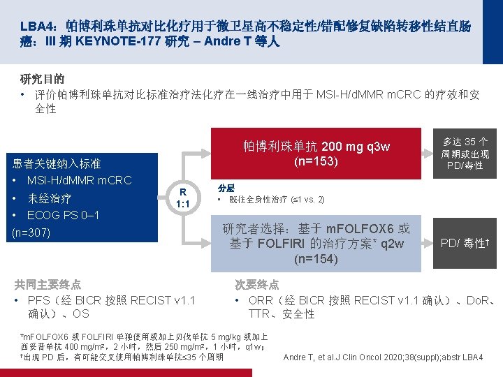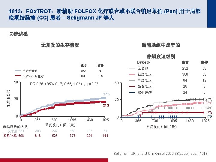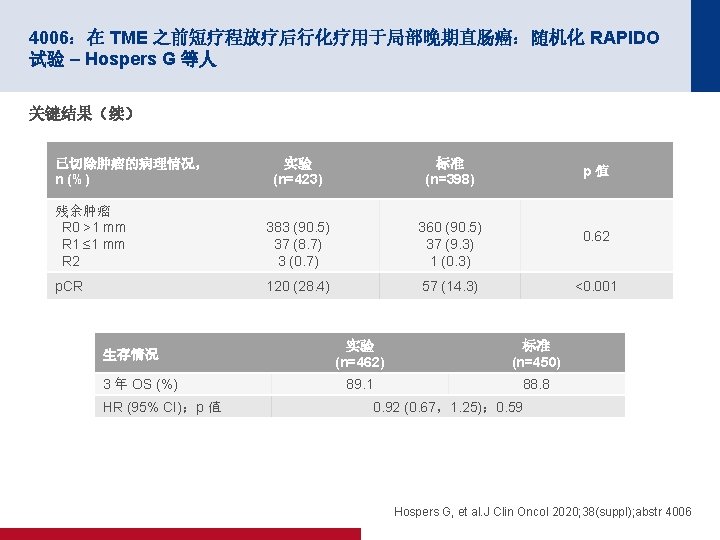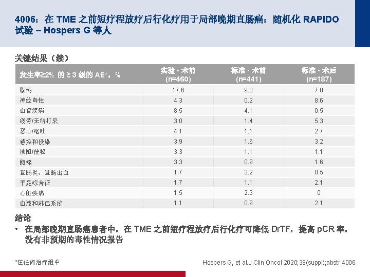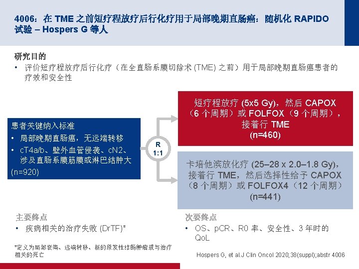 4006:在 TME 之前短疗程放疗后行化疗用于局部晚期直肠癌:随机化 RAPIDO 试验 – Hospers G 等人 关键结果 Dr. TF 1. 0 HR 0. 75(95% CI 为 0. 60,0. 96) p=0. 019 累计概率 0. 8 0. 6 标准 0. 4 30. 4% 0. 2 23. 7% 实验 0 0 1 标准 450 385 334 实验 462 410 367 面临风险的人数 2 3 自随机分组以来的年数 4 5 300 152 127 338 168 135 Hospers G, et al. J Clin Oncol 2020; 38(suppl); abstr 4006