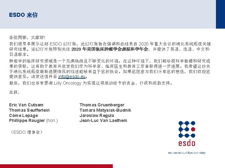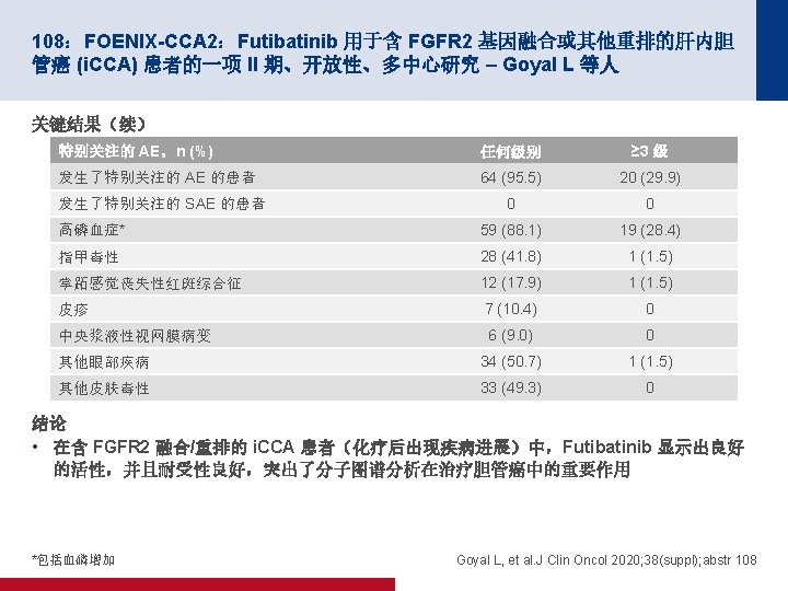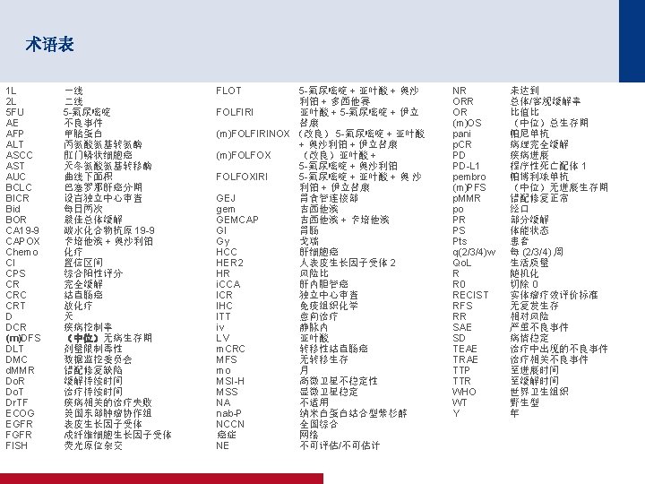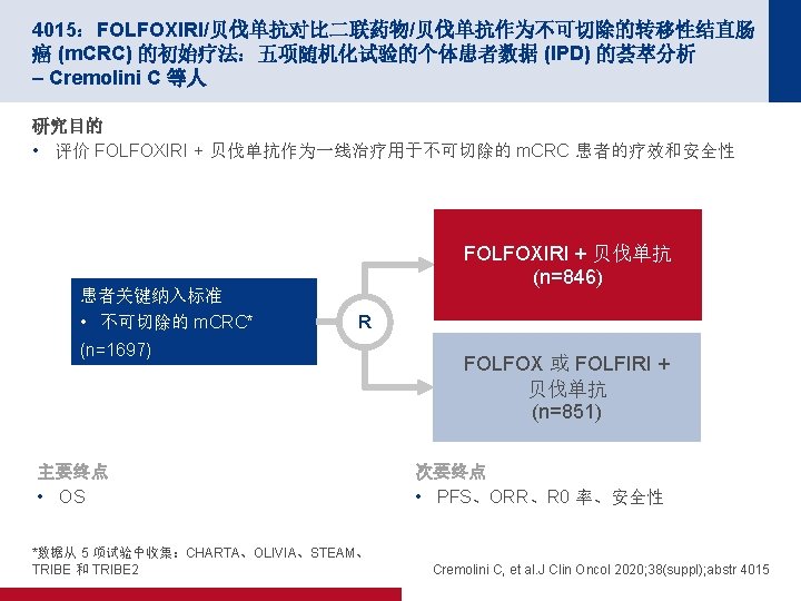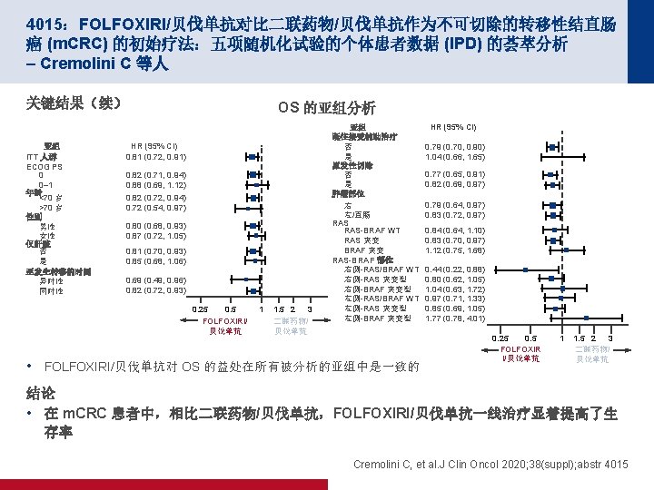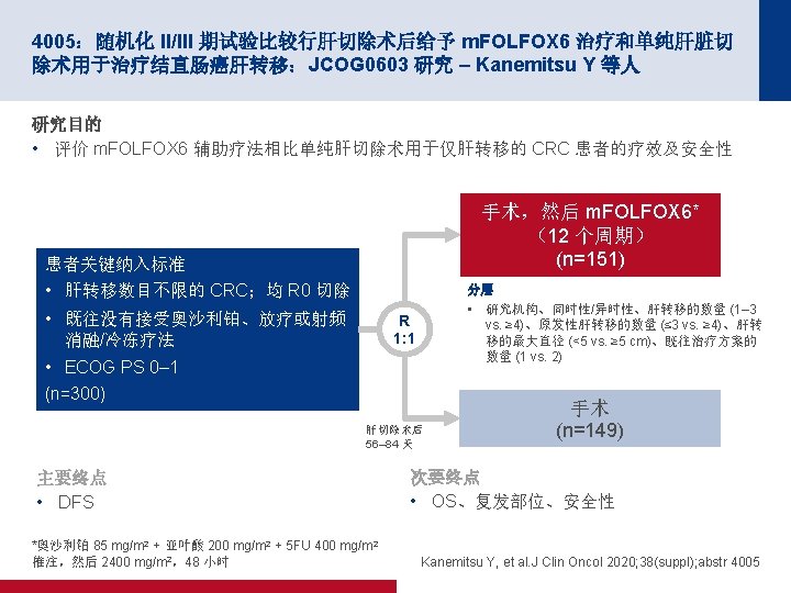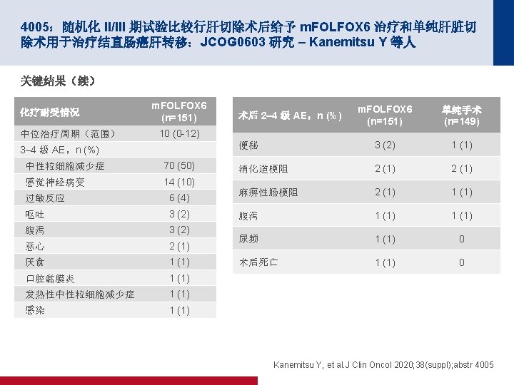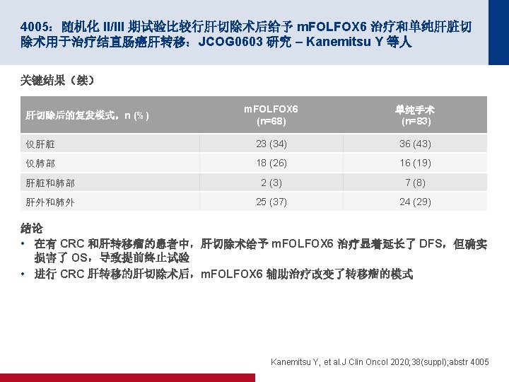 4005:随机化 II/III 期试验比较行肝切除术后给予 m. FOLFOX 6 治疗和单纯肝脏切 除术用于治疗结直肠癌肝转移:JCOG 0603 研究 – Kanemitsu Y 等人 关键结果(续) OS(ITT–更新) m. FOLFOX 6 (n=151) 单纯手术 (n=149) 38 32 3 年 OS, % (95% CI) 87. 2 (80. 2, 91. 9) 91. 8 (85. 7, 95. 4) 5 年 OS, % (95% CI) 71. 2 (61. 7, 78. 8) 83. 1 (74. 9, 88. 9) 事件,n (%) 1. 0 存活比例 0. 8 0. 6 0. 4 0. 2 HR 1. 25(95% CI 为 0. 78,2. 00) 0 面临风险的人数 (删失的人数) 0 1 2 3 4 5 6 7 8 随机分组后的年数 9 10 11 12 13 m. FOLFOX 6 151(0) 148(1) 121(18)102(13) 84(13) 61(12) 55(5) 45(7) 35(10) 24(11) 18(6) 12(5) 2(10) 0(2) 单纯手术 149(0) 144(3) 124(16)108(11) 86(15) 71(13) 59(7) 50(9) 33(11) 23(10) 19(4) 13(6) 3(9) 0(3) *考虑到 m. FOLFOX 6 辅助治疗的 OS 曲线低于单纯手术方法 的 OS 曲线,DMC 建议提前终止试验, Kanemitsu Y, et al. J Clin Oncol 2020; 38(suppl); abstr 4005