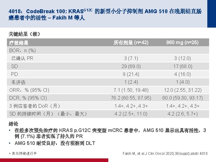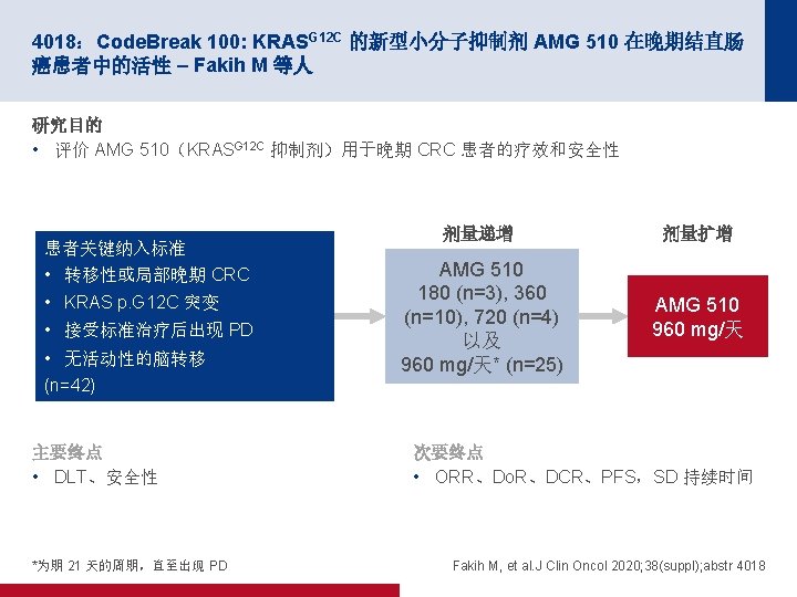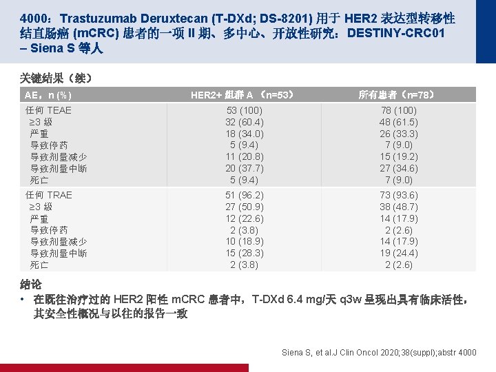 4000:Trastuzumab Deruxtecan (T-DXd; DS-8201) 用于 HER 2 表达型转移性 结直肠癌 (m. CRC) 患者的一项 II 期、多中心、开放性研究:DESTINY-CRC 01 – Siena S 等人 研究目的 • 评价 Trastuzumab Deruxtecan (T-DXd) 用于 HER 2 阳性 m. CRC 患者的疗效和安全性 组群 A:HER 2+ IHC 3+ 或 IHC 2+/ISH+ T-DXd 6. 4 mg/天 q 3 w (n=53) 患者关键纳入标准 • 不可切除的或 m. CRC • HER 2 阳性,RAS/BRAF WT • 既往接受≥ 2 次方案治疗后出现 PD (n=78) 主要终点 • 经 ICR 确认的 ORR(组群 A) R 组群 B:HER 2+ IHC 2+/ISH– T-DXd 6. 4 mg/天 q 3 w (n=7) 组群 C:HER 2+ IHC 1+ T-DXd 6. 4 mg/天 q 3 w (n=18) 次要终点 • DCR、Do. R、PFS、OS、ORR(组群 B & C)、 安全性 Siena S, et al. J Clin Oncol 2020; 38(suppl); abstr 4000