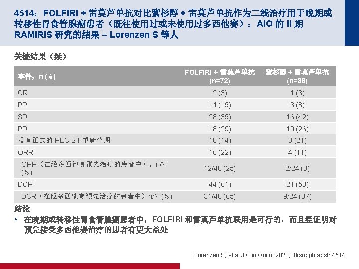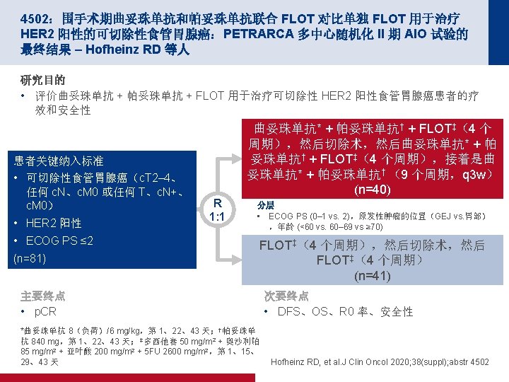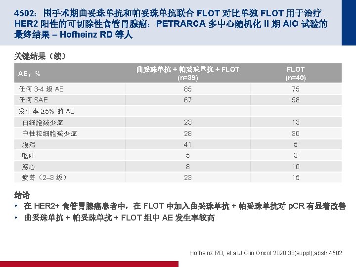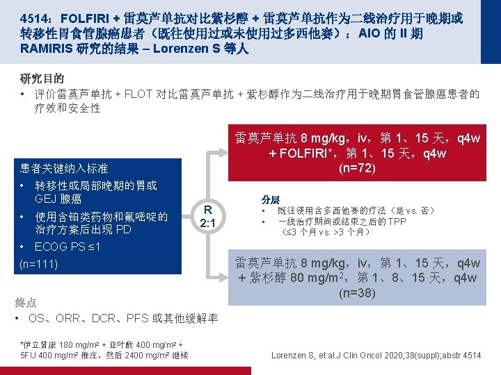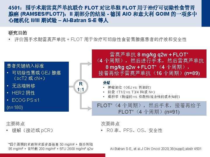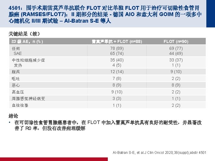 4501:围手术期雷莫芦单抗联合 FLOT 对比单独 FLOT 用于治疗可切除性食管胃 腺癌 (RAMSES/FLOT 7):II 期部分的结果 - 德国 AIO 和意大利 GOIM 的一项多中 心随机化 II/III 期试验 – Al-Batran S-E 等人 关键结果 雷莫芦单抗 + FLOT (n=86) FLOT (n=87) ≤T 1 17 (20) 22 (25) T 2 12 (14) 10 (12) T 3 49 (57) 33 (38) T 4 6 (7) 12 (14) N 0 43 (50) 34 (39) 病理缓解 23 (27) 26 (30) 结局,n (%) p值 R 0 率 p值 0. 7363 83 (97) 72 (83) 0. 0049 Al-Batran S-E, et al. J Clin Oncol 2020; 38(suppl); abstr 4501