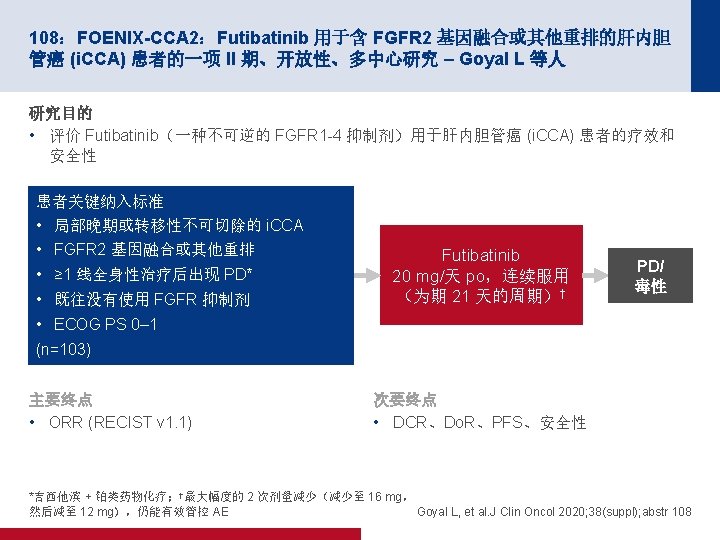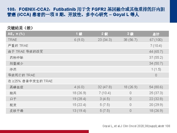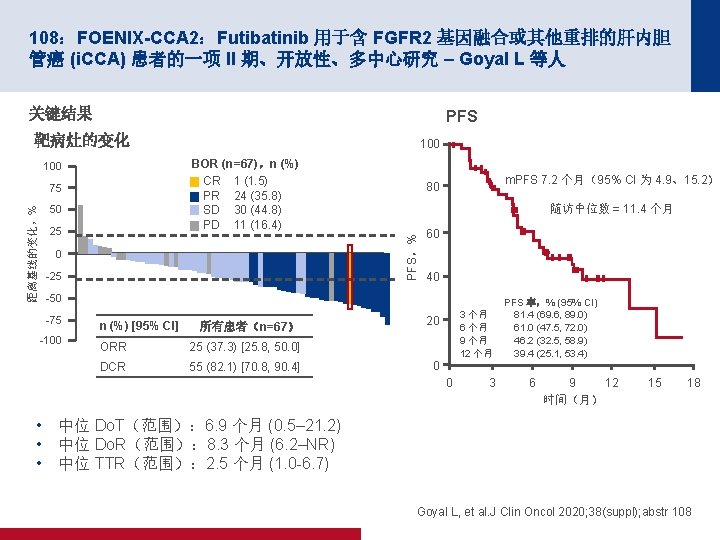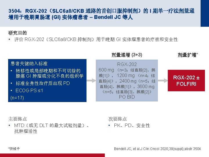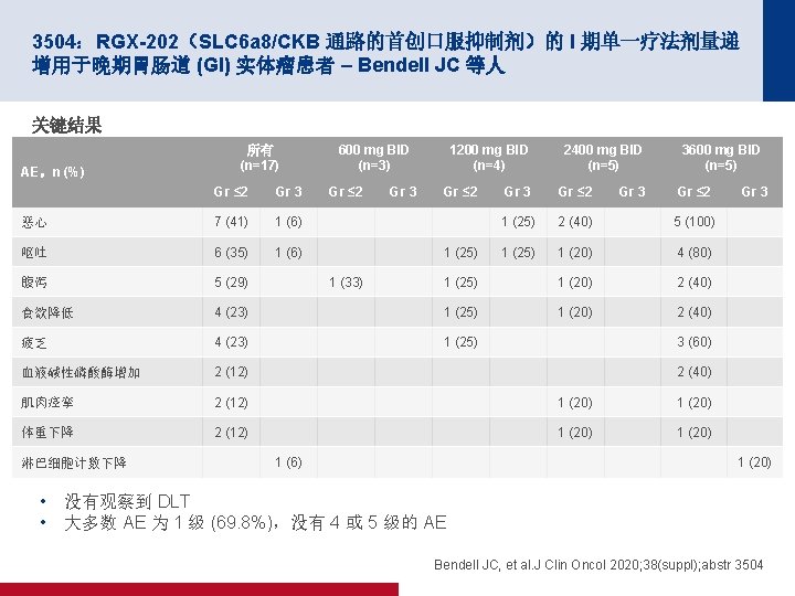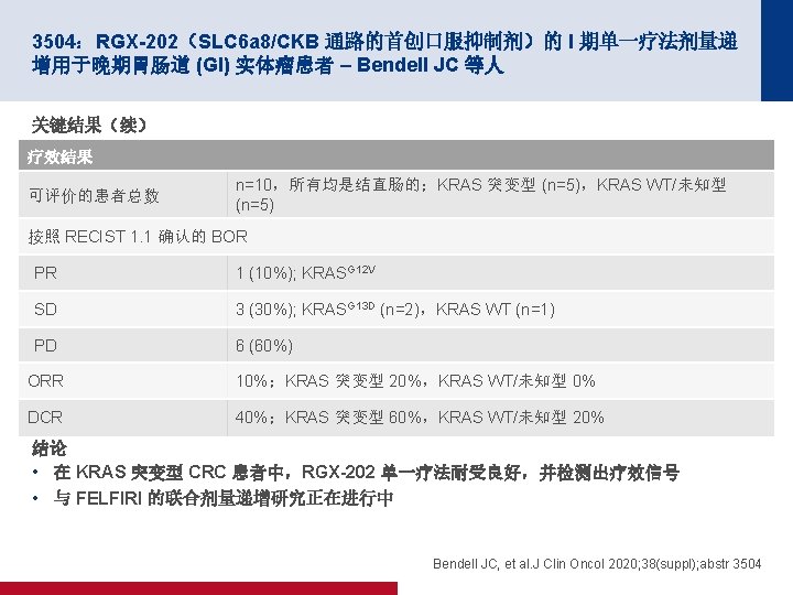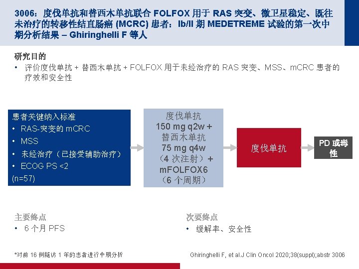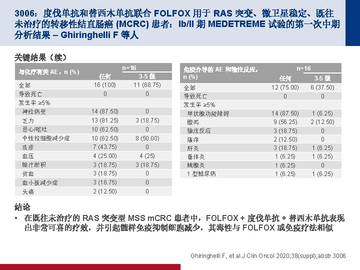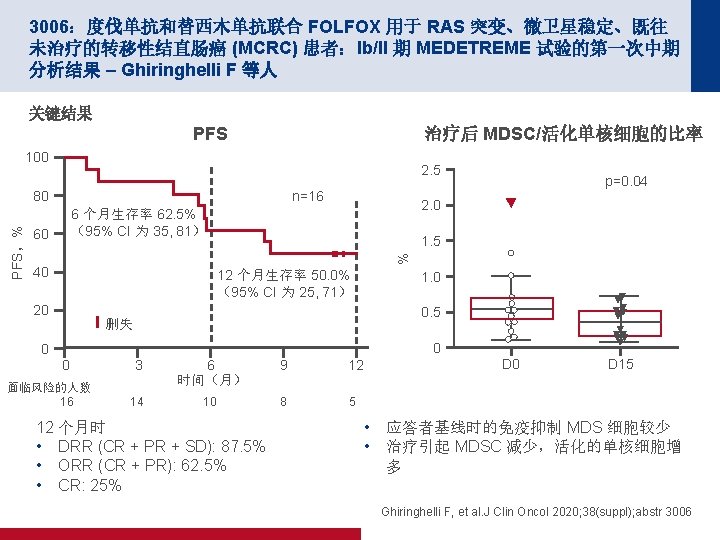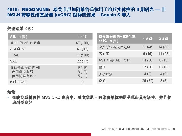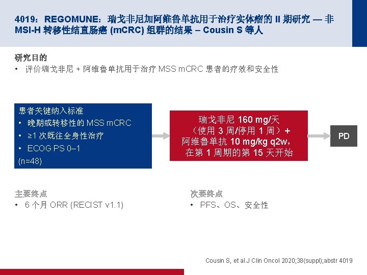 4019:REGOMUNE:瑞戈非尼加阿维鲁单抗用于治疗实体瘤的 II 期研究 — 非 MSI-H 转移性结直肠癌 (m. CRC) 组群的结果 – Cousin S 等人 100 PFS 关键结果 中位 PFS 为 3. 6 个月 (95% CI 为 1. 8, 5. 4) 缓解,n (%) PFS,% 80 n=43 ORR 0 CR/PR 0 60 40 20 0 SD 23 (53. 5) 0 1 2 PD 17 (39. 5) 面临风险的人数 43 41 19 NA 3 (7) 3 4 5 时间(月) 18 10 10 6 7 8 9 2 2 0 0 100 OS OS,% 80 60 40 中位 OS 为 10. 8 个月 (95% CI 为 5. 9,NA) 20 0 0 1 面临风险的人数 43 43 2 3 43 40 4 5 6 7 时间(月) 30 27 20 16 8 9 10 11 12 9 6 3 1 0 Cousin S, et al. J Clin Oncol 2020; 38(suppl); abstr 4019