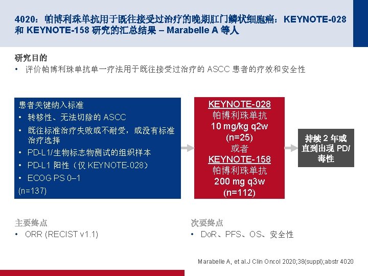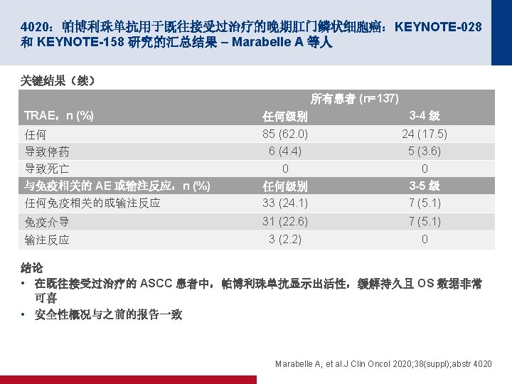 4020:帕博利珠单抗用于既往接受过治疗的晚期肛门鳞状细胞癌:KEYNOTE-028 和 KEYNOTE-158 研究的汇总结果 – Marabelle A 等人 关键结果 PFS 100 所有患者 (n=137*) CR,n (%) 8 (5. 8) PR,n (%) 7 (5. 1) SD,n (%) 27 (19. 7) PD,n (%) 84 (61. 3) Do. R 中值(月)(范围) 12 个月,% 24 个月,% PFS,% 10. 9 (6. 3, 17. 4) 14. 0 3. 3 60 40 事件 n/N (%) 中位数(月) (95% CI) 123/137 (89. 8) 2. 1 (2. 0, 2. 1) 20 0 0 3 6 9 12 15 18 21 24 27 30 33 36 39 42 45 48 51 54 57 60 63 时间(月) 面临风险的人数 137 44 27 22 18 16 15 11 10 10 10 7 2 2 2 1 1 1 0 0 100 OS 12 个月生存率 24 个月生存率 47. 4% 24. 0% 80 NR(6. 0+ 至 57. 5+) 84. 6 OS,% ORR,% (95% CI) 总计 PD-L 1+ PD-L 1 - 80 12 个月生存率 24 个月生存率 14. 5% 8. 7% 60 事件 n/N (%) 中位数(月) (95% CI) 40 112/137 (81. 8) 11. 7 (8. 8, 14. 5) 20 0 0 3 6 9 12 15 18 21 24 27 30 33 36 39 42 45 48 51 54 57 60 63 时间(月) 面临风险的人数 137123 97 80 65 55 46 36 32 26 26 18 7 4 *对于 PD-L 1+,n=100;对于 PD-L 1 -,n=30 3 2 2 2 0 Marabelle A, et al. J Clin Oncol 2020; 38(suppl); abstr 4020