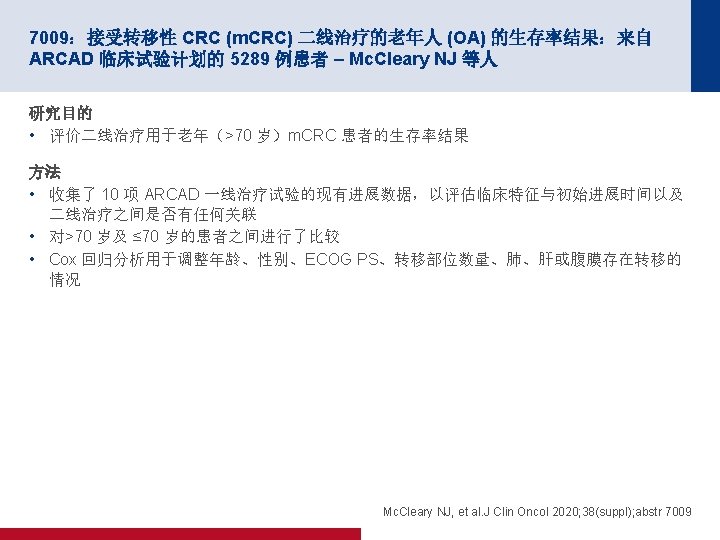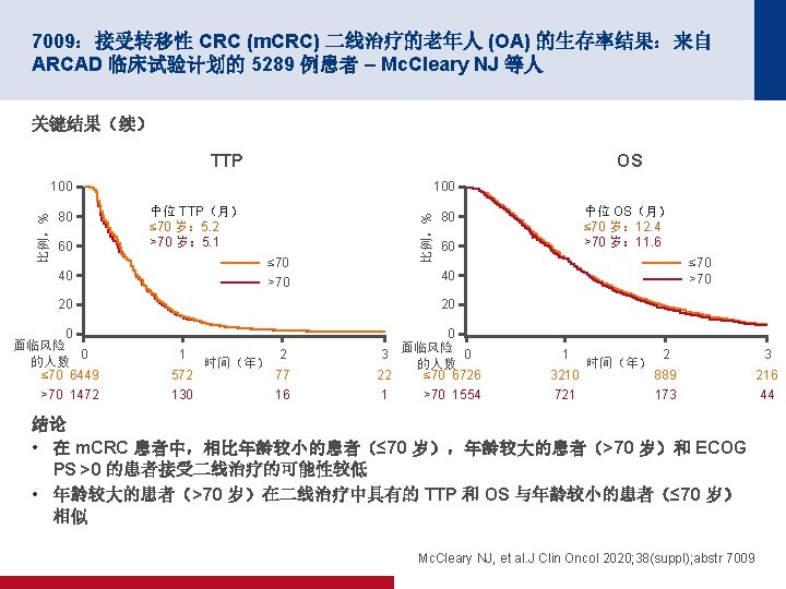 7009:接受转移性 CRC (m. CRC) 二线治疗的老年人 (OA) 的生存率结果:来自 ARCAD 临床试验计划的 5289 例患者 – Mc. Cleary NJ 等人 关键结果 一线治疗 初始出现进展的时间 (N=5289; 5121 例可评价) 特点 OR (95% CI) p值 招募年龄均值 (SD) 59. 8 (10. 7) 1. 11 (1. 02, 1. 21) 0. 012 性别,n (%) 男性 2880 (87. 2) 1. 15 (0. 96, 1. 38) (♀所指对象) 0. 121 ECOG PS,n (%) 0 2566 (90. 4) 所指对象 1 1815 (85. 8) >1 115 (69. 7) 肺部 1562 (87. 4) 肝脏 3421 (88. 0) 腹膜 407 (88. 1) 转移 1. 55 (1. 30, 1. 84) 4. 07 (2. 85, 5. 82) 1. 03 (0. 86, 1. 23) 0. 90 (0. 75, 1. 09) 0. 92 (0. 68, 1. 24) <0. 0001 0. 761 0. 291 0. 571 二线治疗 出现进展的时间 (N=7921; 7408 例可评价) 年龄, 每 10 年 二线治疗 OS (N=8280; 7764 例可评价) HR (95% CI) p值 0. 97 (0. 94, 0. 99) 0. 005 0. 99 (0. 97, 1. 02) 0. 618 0. 98 (0. 94, 1. 04) 0. 54 0. 97 (0. 92, 1. 02) 0. 204 1. 22 (1. 16, 1. 28) 1. 59 (1. 38, 1. 83) 1. 10 (1. 04, 1. 18) 1. 36 (1. 28, 1. 45) 1. 27 (1. 03, 1. 57) <0. 001 0. 003 <0. 001 0. 025 1. 51 (1. 43, 1. 59) 3. 54 (3. 13, 4. 02) 1. 08 (1. 01, 1. 16) 1. 62 (1. 52, 1. 74) 1. 42 (1. 14, 1. 75) <0. 0001 0. 02 <0. 001 Mc. Cleary NJ, et al. J Clin Oncol 2020; 38(suppl); abstr 7009