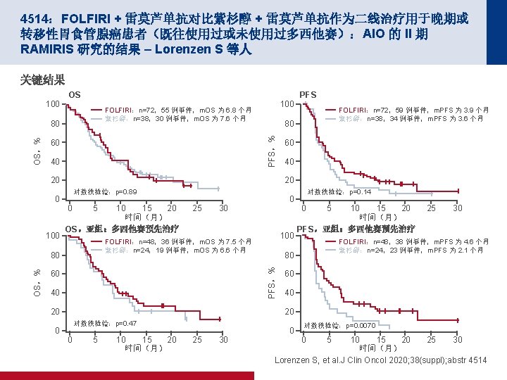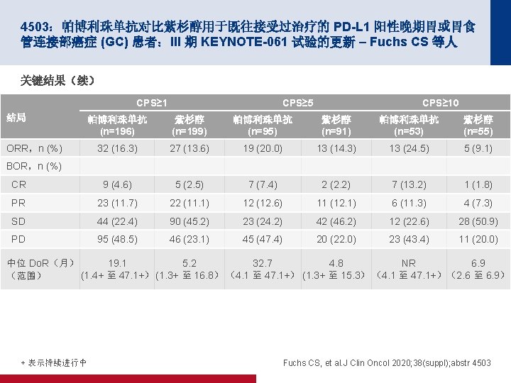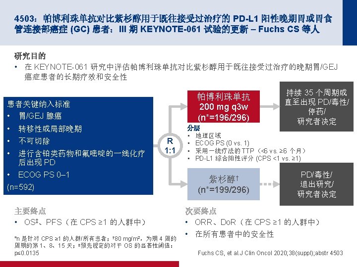 4503:帕博利珠单抗对比紫杉醇用于既往接受过治疗的 PD-L 1 阳性晚期胃或胃食 管连接部癌症 (GC) 患者:III 期 KEYNOTE-061 试验的更新 – Fuchs CS 等人 关键结果 OS CPS≥ 1 CPS≥ 5 CPS≥ 10 事件/患者 HR (95% CI) 帕博利珠单抗 176/196 84/95 190/199 0. 72 (0. 53, 0. 99) 44/53 紫杉醇 0. 81 (0. 66, 1. 00) 0. 69 (0. 46, 1. 05) m. OS(月)(95% CI) 9. 1 (6. 2, 10. 7) 8. 3 (7. 6, 9. 0) 51/55 80 m. OS(月)(95% CI) 100 10. 4 (6. 7, 15. 5) 8. 3 (6. 8, 9. 4) 80 60 60 60 40 40 40 20 20 20 100 80 OS,% 86/91 0 100 0 6 12 18 24 30 36 42 48 54 时间(月) m. OS(月)(95% CI) 10. 4 (5. 9, 18. 3) 8. 0 (5. 1, 9. 9) 0 6 12 18 24 30 36 42 48 54 时间(月) 面临风险的人数 196 114 78 52 39 30 25 16 9 0 95 61 43 30 23 19 15 9 6 0 53 34 24 20 17 14 10 7 5 0 199 130 54 30 17 15 11 0 91 57 23 16 8 4 2 0 55 33 13 11 6 3 2 0 7 2 7 5 5 4 Fuchs CS, et al. J Clin Oncol 2020; 38(suppl); abstr 4503