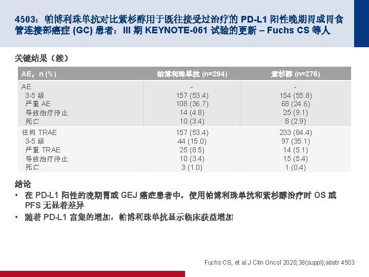 4503:帕博利珠单抗对比紫杉醇用于既往接受过治疗的 PD-L 1 阳性晚期胃或胃食 管连接部癌症 (GC) 患者:III 期 KEYNOTE-061 试验的更新 – Fuchs CS 等人 关键结果(续) PFS CPS≥ 1 CPS≥ 5 CPS≥ 10 事件/患者 HR (95% CI) 帕博利珠单抗 185/196 87/95 192/199 0. 98 (0. 71, 1. 34) 45/53 紫杉醇 1. 25 (1. 02, 1. 54) 0. 79 (0. 51, 1. 21) m. PFS(月)(95% CI) 1. 5 (1. 4, 2. 0) 4. 1 (3. 2, 4. 3) 100 PFS,% 80 87/91 m. PFS(月)(95% CI) 1. 6 (1. 4, 2. 8) 4. 0 (2. 8, 4. 4) 100 80 52/55 80 60 60 60 40 40 40 20 20 20 0 6 12 18 24 30 36 42 48 54 时间(月) m. PFS(月)(95% CI) 2. 7 (1. 4, 4. 3) 4. 0 (2. 7, 4. 4) 100 0 0 6 12 18 24 30 36 42 48 54 时间(月) 面临风险的人数 196 40 28 22 19 14 11 7 2 0 95 24 19 15 13 11 8 5 2 0 53 17 14 13 12 10 7 5 2 0 199 61 23 12 5 1 0 0 91 27 0 0 0 55 15 0 0 0 4 2 8 6 2 1 0 4 3 1 0 0 Fuchs CS, et al. J Clin Oncol 2020; 38(suppl); abstr 4503