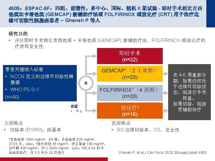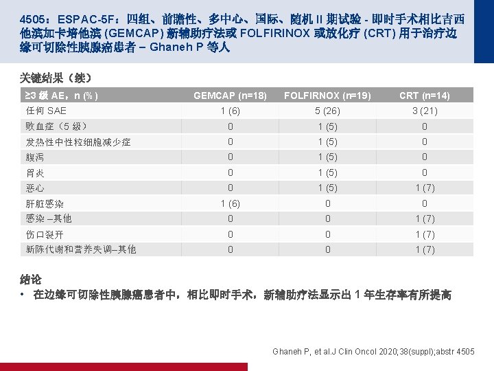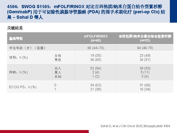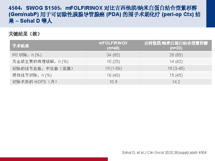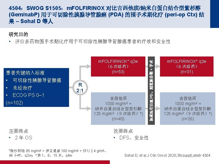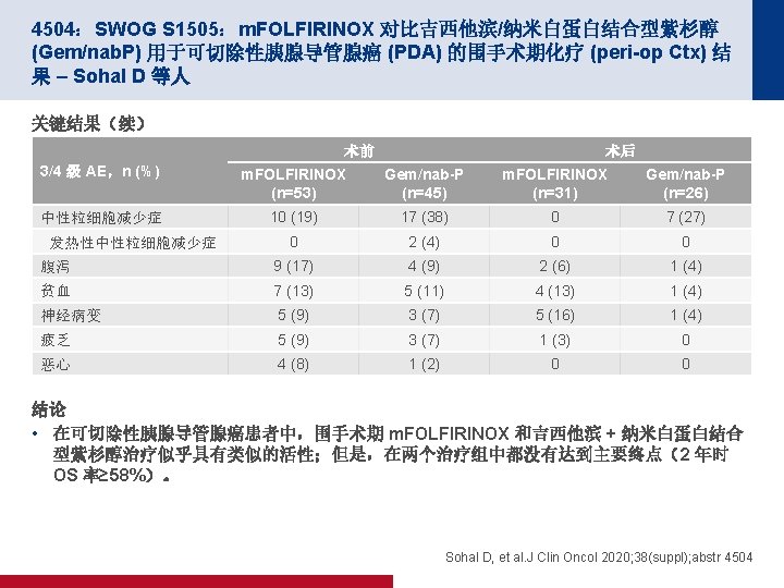 4504:SWOG S 1505:m. FOLFIRINOX 对比吉西他滨/纳米白蛋白结合型紫杉醇 (Gem/nab. P) 用于可切除性胰腺导管腺癌 (PDA) 的围手术期化疗 (peri-op Ctx) 结 果 – Sohal D 等人 关键结果(续) OS 100 OS,% 80 2 年 OS (%) m. OS(月) 面临风险 失败 m. FOLFIRINOX 55 32 43. 1 22. 4 Gem/nab-P 47 28 46. 9 23. 6 目标: 2 年时为 58% 60 40 20 0 0 6 12 18 24 注册后月数 30 36 42 Sohal D, et al. J Clin Oncol 2020; 38(suppl); abstr 4504