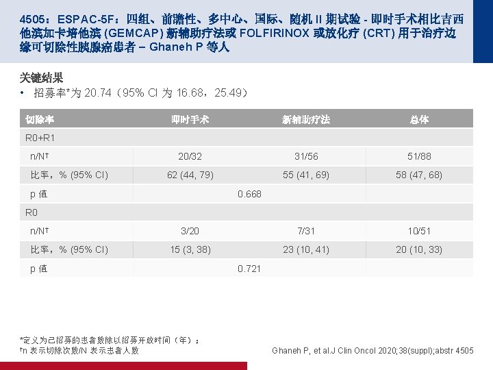 4505:ESPAC-5 F:四组、前瞻性、多中心、国际、随机 II 期试验 - 即时手术相比吉西 他滨加卡培他滨 (GEMCAP) 新辅助疗法或 FOLFIRINOX 或放化疗 (CRT) 用于治疗边 缘可切除性胰腺癌患者 – Ghaneh P 等人 关键结果(续) OS 100 一年 OS,% (95% CI) OS,% 80 即时手术 GEMCAP FOLFIRINOX CRT 新辅助疗法* 60 40 即时手术 GEMCAP FOLFIRINOX CRT 新辅助疗法 20 0 0 面临风险的人数 32 20 20 16 56 42 (27, 64) 79 (62, 100) 84 (70, 100) 64 (43, 95) 77 (66, 89) HRGEMCAP 0. 32(95% CI 为 0. 12, 0. 85) HRFOLFIRINOX 0. 16(95% CI 为 0. 05, 0. 56) HRCRT 0. 41(95% CI 为 0. 15, 1. 10) X 2 (3) = 14. 76, p=0. 002 2 4 31 20 19 14 53 25 19 19 14 52 *GEMCAP 或 FOLIRINOX 或 CRT 6 8 时间(月) 21 18 17 13 48 18 17 16 11 44 10 12 16 16 16 10 42 7 7 14 8 29 HR新辅助 0. 28 (95% CI 为 0. 14, 0. 57) X 2 (1) = 13. 77, p<0. 001 Ghaneh P, et al. J Clin Oncol 2020; 38(suppl); abstr 4505